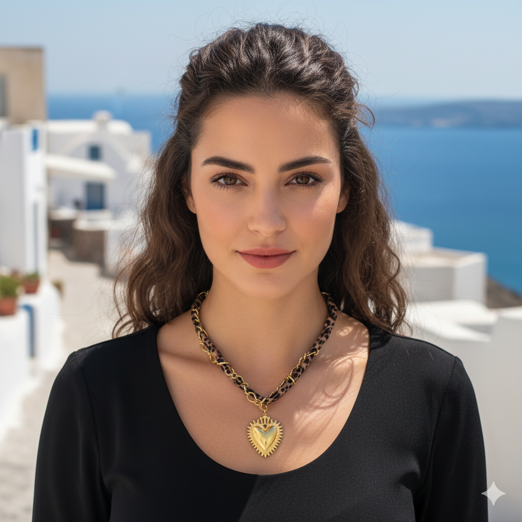 Ατσάλινο καουμπόικο κολιέ με καρδιά σε leopard κορδόνι