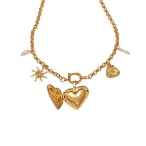 Ατσάλινο κολιέ με χρυσή αλυσίδα και εντυπωσιακά charms — καρδιά που ανοίγει για να τοποθετήσεις φωτογραφία, ήλιος, κοχύλι και πέρλες. Ένα ρομαντικό και διαχρονικό κόσμημα με vintage αισθητική.Μήκος: 40 cmΜέγεθος μενταγιόν: 2,5 cm