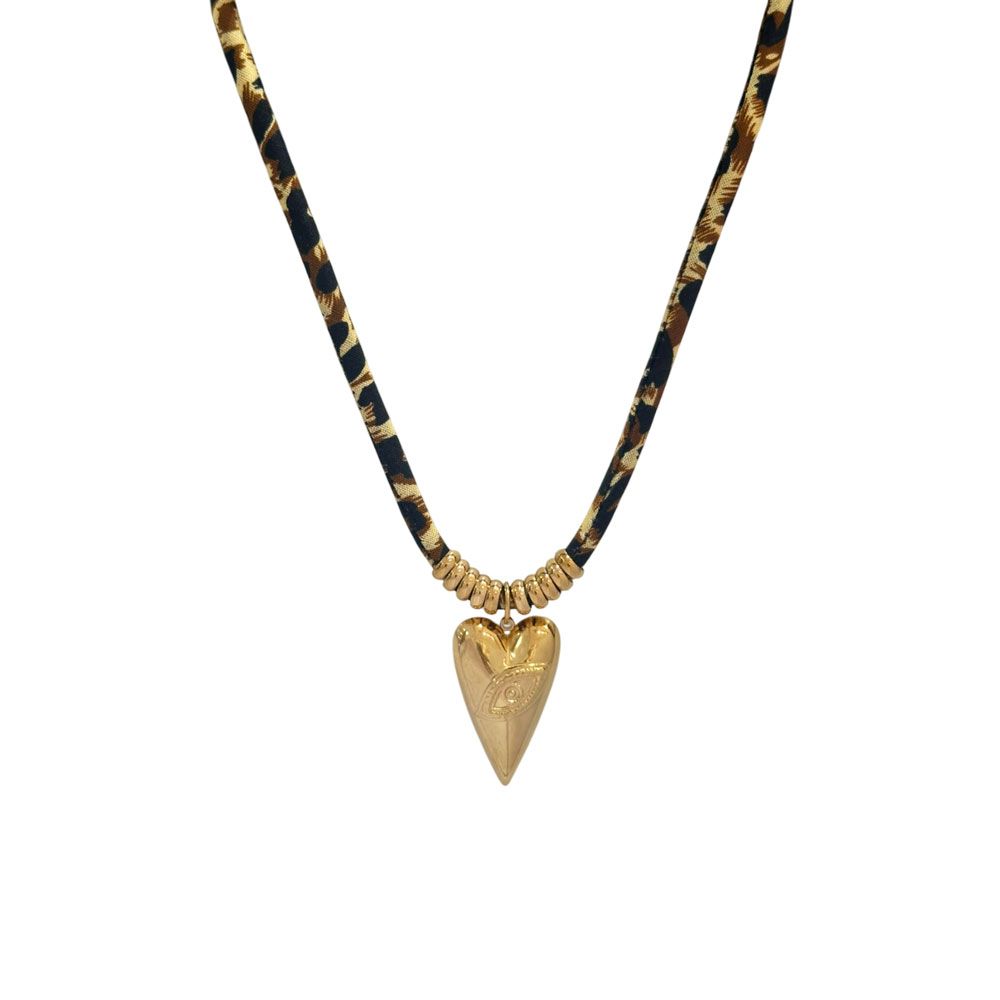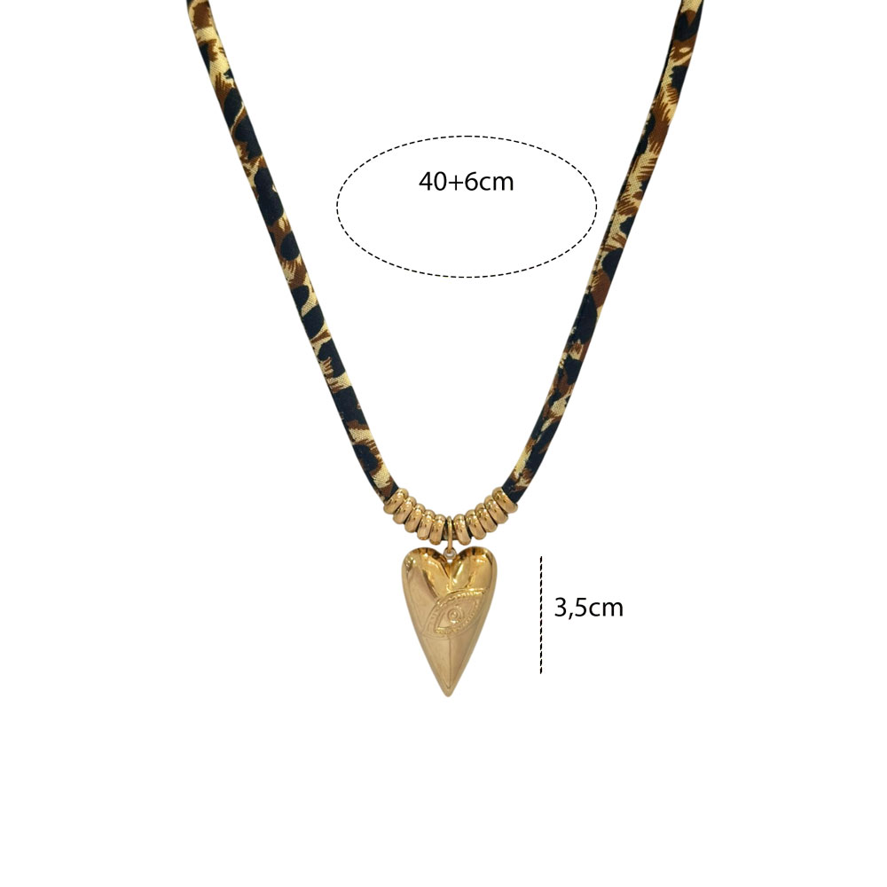 Ατσάλινο κολιέ με leopard υφασμάτινο κορδόνι και μακρόστενη καρδιά με διακριτική χάραξη ματιού. Ένα μοντέρνο και εκφραστικό κόσμημα που συνδυάζει boho και chic ύφος.Μήκος: 40 + 6 cmΜέγεθος μενταγιόν: 3,5 cm