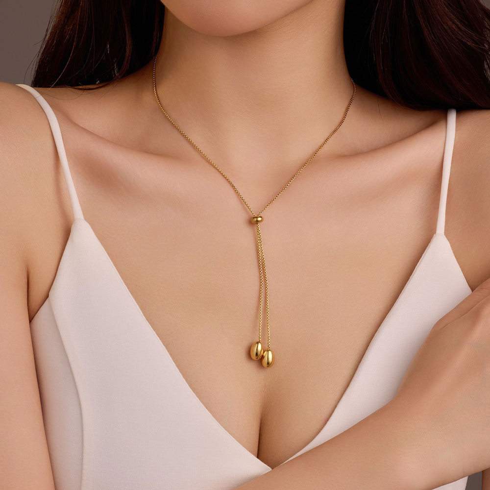 Μοντέρνο ατσάλινο κολιέ με ρυθμιζόμενο κόμπο και δύο μεταλλικές σταγόνες που χαρίζουν κίνηση και λάμψη. Ο minimal σχεδιασμός του το καθιστά ιδανικό για καθημερινές αλλά και πιο κομψές εμφανίσεις.Κατασκευασμένο από υψηλής ποιότητας ατσάλι που δεν μαυρίζει, προσφέρει ανθεκτικότητα και διαχρονικό στυλ. Μπορεί να φορεθεί μόνο του ή να συνδυαστεί με άλλα κολιέ για πιο εντυπωσιακό αποτέλεσμα.