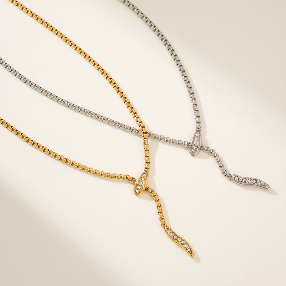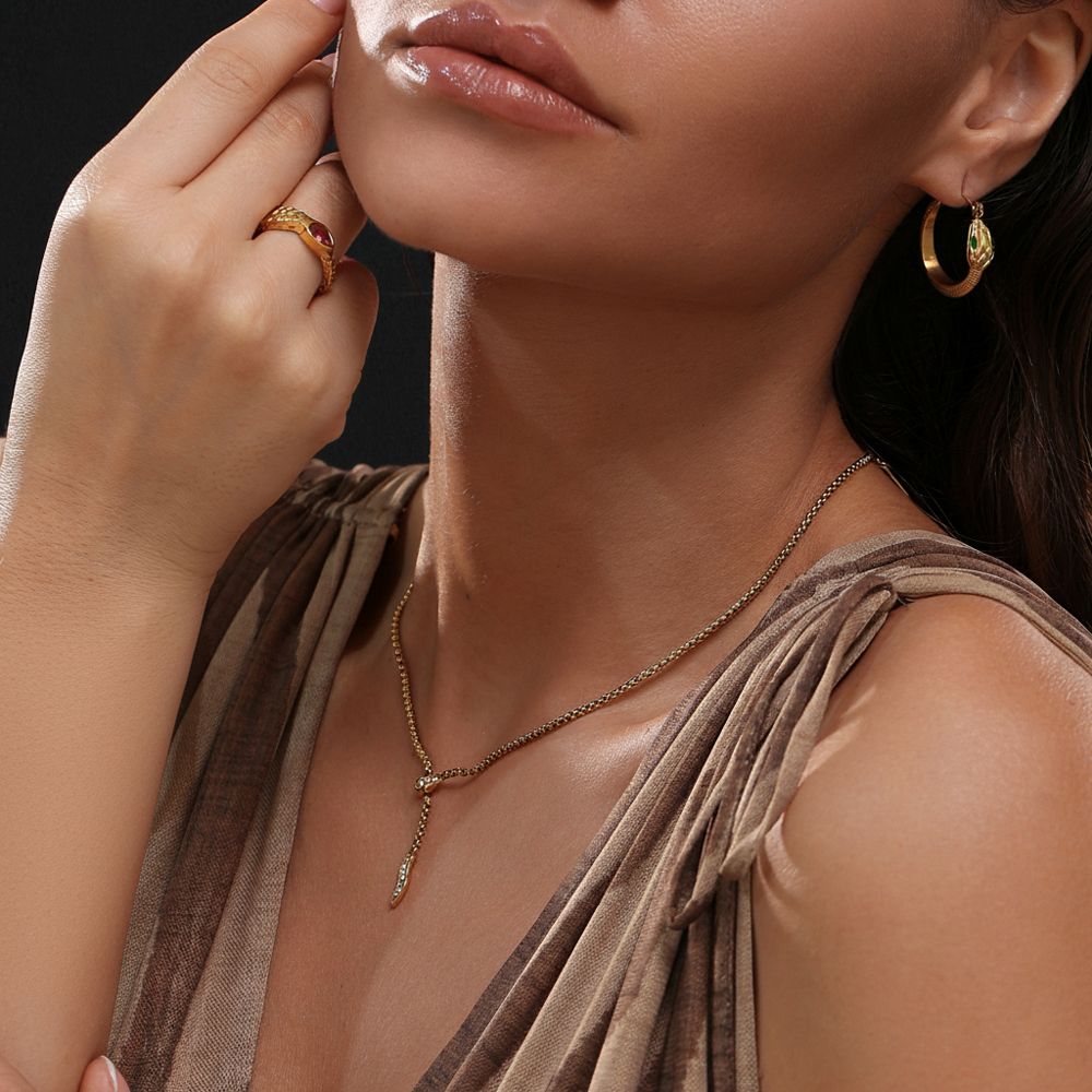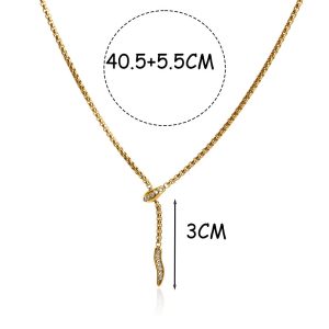 Κομψό ατσάλινο κολιέ με μοντέρνο σχέδιο φίδι, διακοσμημένο με λαμπερά ζιργκόν. Η λεπτή χρυσή αλυσίδα και η καμπύλη του μοτίφ δημιουργούν ένα εκλεπτυσμένο αποτέλεσμα, ιδανικό για εμφανίσεις με διακριτική πολυτέλεια. Ένα statement κόσμημα που συνδυάζει θηλυκότητα και δυναμισμό. Υλικό: Ανοξείδωτο ατσάλι με ζιργκόν Μήκος: 40.5 + 5.5 cm Δεν μαυρίζει, δεν προκαλεί αλλεργίες Μοντέρνος και εντυπωσιακός σχεδιασμός Ιδανικό για κομψές καθημερινές ή βραδινές εμφανίσεις