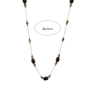 Κομψό μακρύ κολιέ με πράσινες και καφέ χάντρες σε διαφορετικά σχήματα και αποχρώσεις, δεμένες σε λεπτή χρυσή αλυσίδα. Οι γήινες αποχρώσεις του συνδυάζονται αρμονικά, δημιουργώντας ένα φυσικό και elegant αποτέλεσμα.Ιδανικό για καθημερινές εμφανίσεις, προσθέτει ζεστασιά και στυλ σε κάθε ντύσιμο.