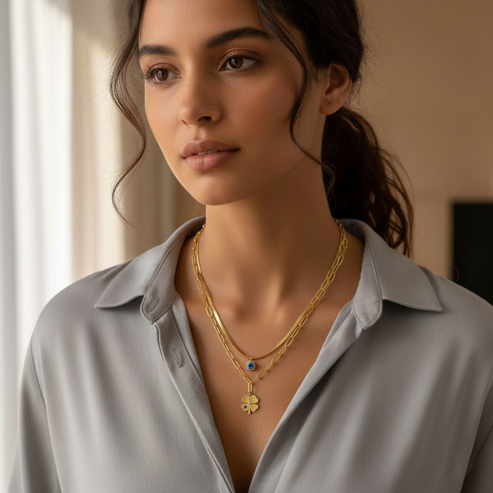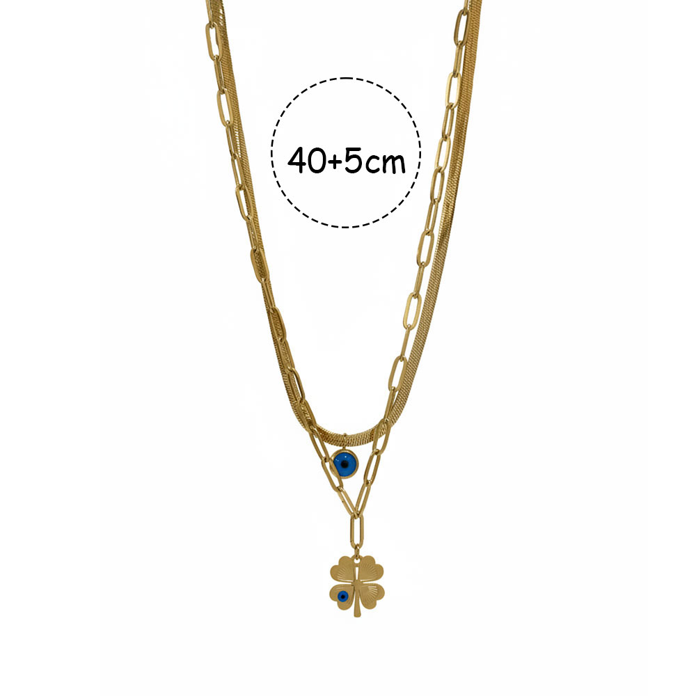 Μοντέρνο κολιέ από ατσάλι με εντυπωσιακή διπλή αλυσίδα σε χρυσό τόνο. Η μία αλυσίδα είναι τύπου snake chain, ενώ η άλλη διαθέτει μεγαλύτερους κρίκους, δημιουργώντας ένα δυναμικό και στιλάτο layering. Το κολιέ διακοσμείται με κρεμαστό ματάκι και χρυσό τετράφυλλο τριφύλλι με μπλε λεπτομέρεια, σύμβολα προστασίας και καλής τύχης. Ιδανικό για να ολοκληρώσει κάθε σύνολο με χαρακτήρα και κομψότητα. Μήκος Αλυσίδας: 40εκ. Προέκταση: 5 εκ.