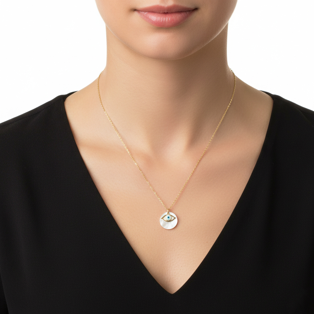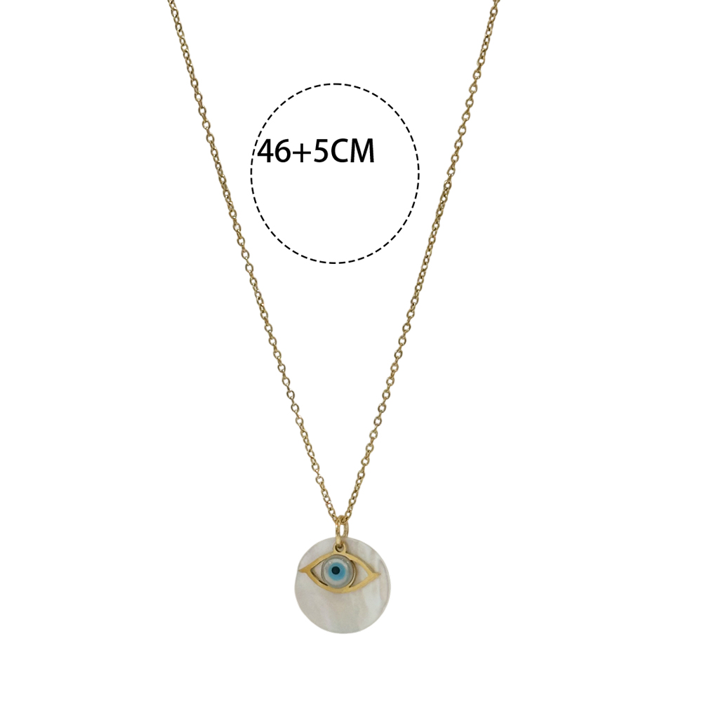 Εντυπωσιακό και κομψό κολιέ από ατσάλι με στρογγυλό στοιχείο από φίλντισι και κεντρικό ματάκι για προστασία και στυλ. Το διακριτικό του σχέδιο το καθιστά ιδανικό για καθημερινή χρήση, ενώ το φίλντισι χαρίζει φυσική λάμψη και μια elegant πινελιά σε κάθε εμφάνιση.