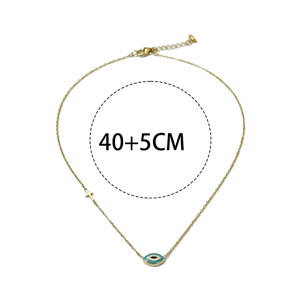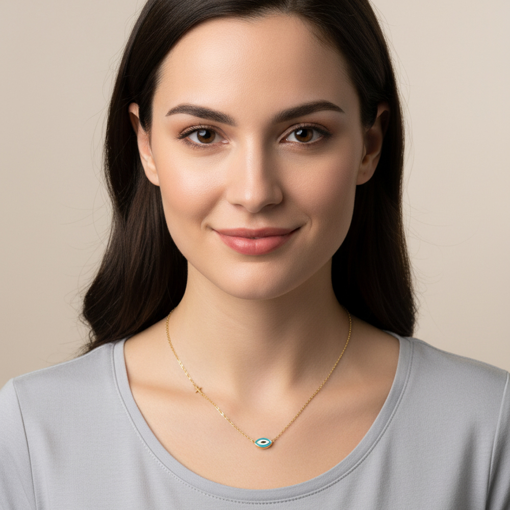 Minimal χρυσό κολιέ με μοντέρνο στοιχείο ματιού σε τιρκουάζ αποχρώσεις και διακριτικό σταυρουδάκι στο πλάι. Φοριέται μόνο του ή σε layering με άλλα κοσμήματα, προσφέροντας καθημερινή λάμψη και προστασία. Ελαφρύ και κομψό, αποτελεί ιδανική επιλογή για διακριτική αλλά εντυπωσιακή εμφάνιση.