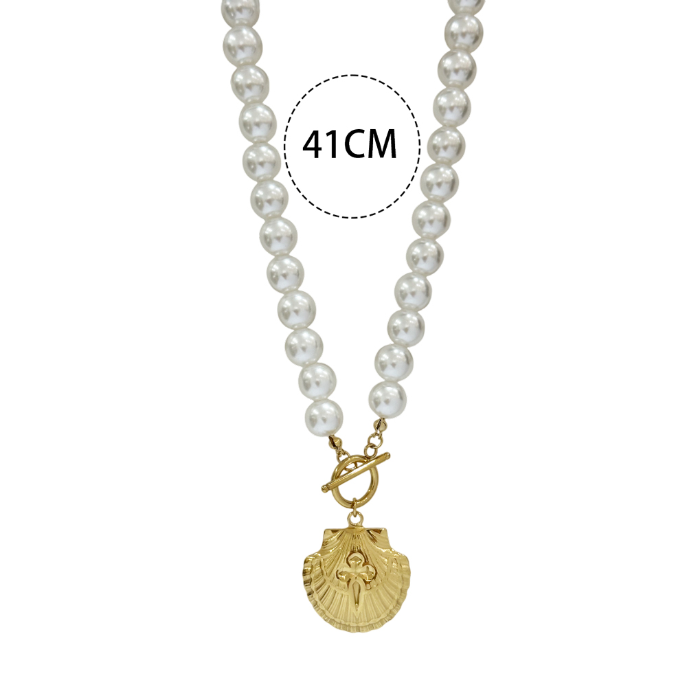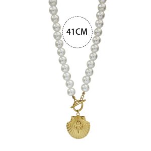 Εντυπωσιακό choker από ανοξείδωτο ατσάλι, διακοσμημένο με λευκές πέρλες και κρεμαστό χρυσό κοχύλι με ανάγλυφες λεπτομέρειες. Ο elegant σχεδιασμός του προσδίδει διαχρονικό στυλ, ενώ το κοχύλι χαρίζει καλοκαιρινή και εκλεπτυσμένη πινελιά. Ιδανική επιλογή για να αναβαθμίσει κάθε εμφάνιση και εξαιρετικό ως δώρο Μήκος Αλυσίδας: 41 εκ. Προέκταση: 5 εκ.