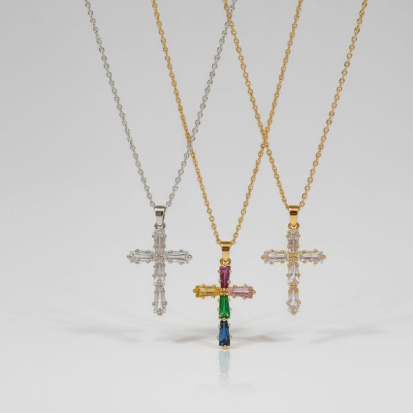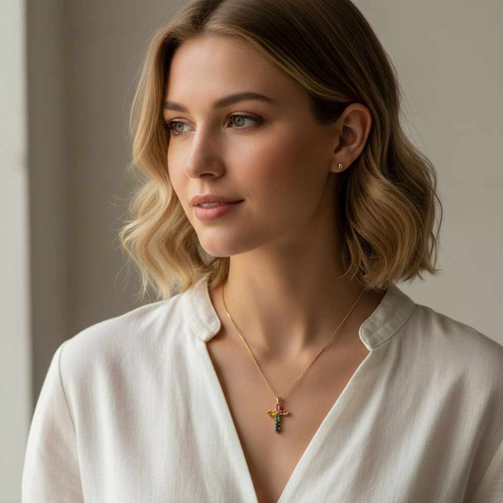 Κομψό κολιέ με ατσάλινη αλυσίδα και εντυπωσιακό σταυρό διακοσμημένο με λαμπερές, πολύχρωμες πέτρες. Ο σταυρός δεν είναι από ατσάλι, αλλά χαρίζει μοναδική λάμψη και ξεχωριστό χαρακτήρα σε κάθε εμφάνιση.Η αλυσίδα από ανθεκτικό ανοξείδωτο ατσάλι δεν μαυρίζει και παραμένει λαμπερή, ιδανική για καθημερινή χρήση ή για να ολοκληρώσει ένα elegant βραδινό look.