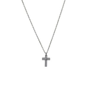 Αριστοκρατικό και minimal stainless steel κολιέ με μικρό σταυρό, διακοσμημένο στο κέντρο με λαμπερό ζιργκόν. Ο διακριτικός του σχεδιασμός το καθιστά ιδανικό για καθημερινή χρήση, ενώ το μικρό διαμάντι προσθέτει μια κομψή πινελιά λάμψης. Κατασκευασμένο από ανοξείδωτο ατσάλι, παραμένει ανθεκτικό και δεν αλλοιώνεται με τον χρόνο.