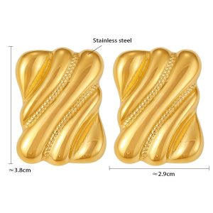 Ορθογώνια σκουλαρίκια από ανοξείδωτο ατσάλι με ανάγλυφη, κυματιστή επιφάνεια και λαμπερό χρυσό φινίρισμα. Ένα μοντέρνο και δυναμικό σχέδιο που προσδίδει κομψότητα και χαρακτήρα σε κάθε εμφάνιση, ιδανικό για καθημερινή αλλά και βραδινή χρήση.