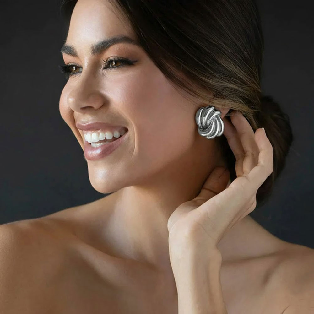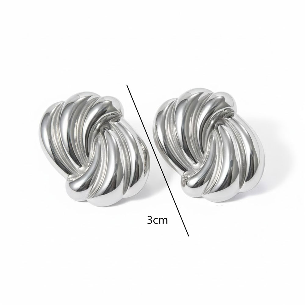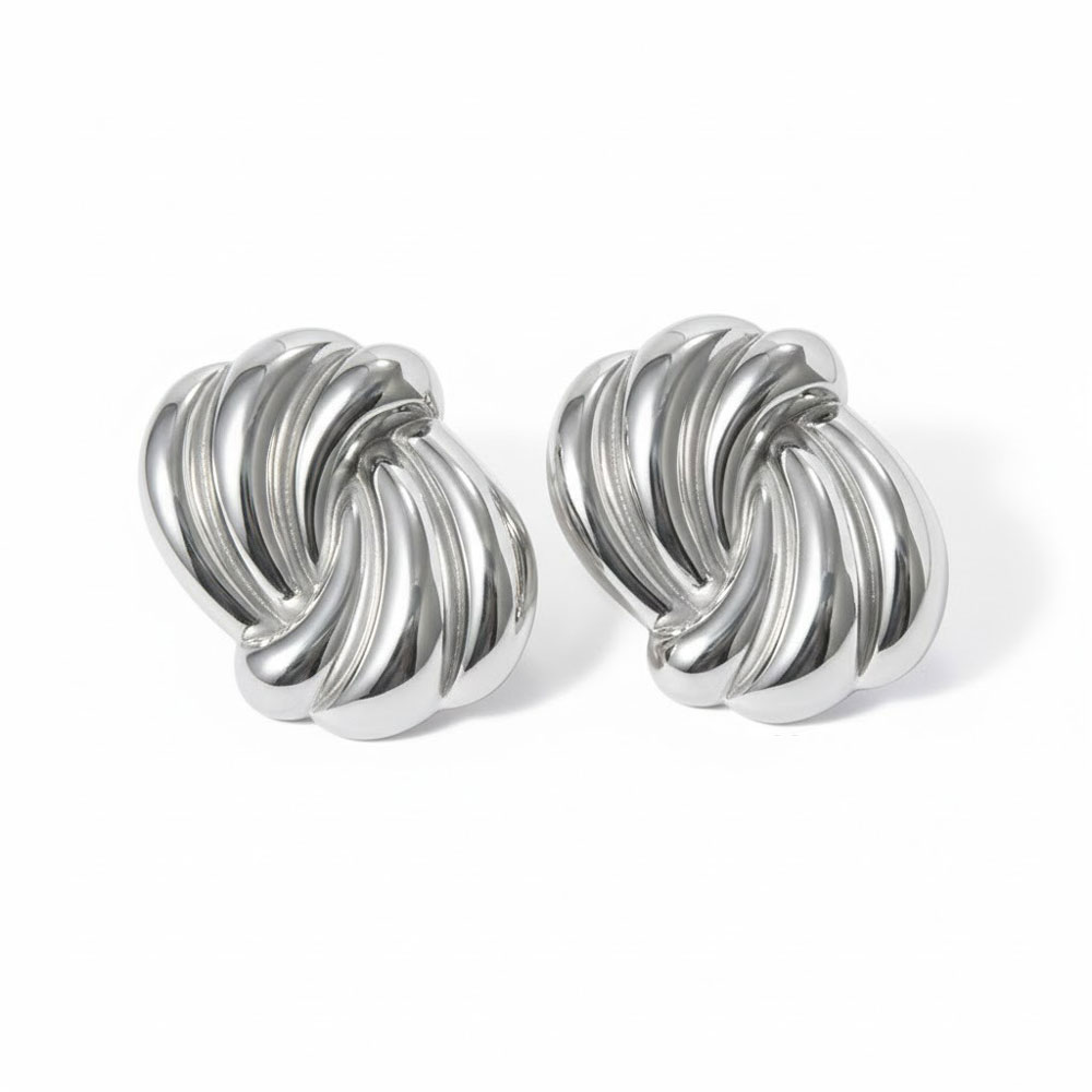 Εντυπωσιακά σκουλαρίκια από ανοξείδωτο ατσάλι με σχέδιο κόμπου και γυαλιστερό φινίρισμα. Οι καμπύλες γραμμές δημιουργούν ένα δυναμικό, ανάγλυφο αποτέλεσμα που αποπνέει σύγχρονη κομψότητα και διαχρονικό χαρακτήρα. Το συμπαγές τους σχήμα προσφέρει ένταση στο look χωρίς να χάνει την ισορροπία και την άνεση στην εφαρμογή. Ιδανικά για elegant εμφανίσεις αλλά και για να αναβαθμίσουν ένα απλό καθημερινό σύνολο με μια μοντέρνα πινελιά.