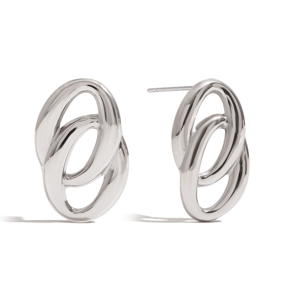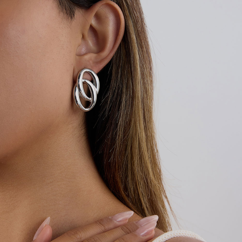 Κομψά και σύγχρονα σκουλαρίκια από ανοξείδωτο ατσάλι, με εντυπωσιακό σχεδιασμό διπλών κρίκων που αγκαλιάζουν απαλά το αυτί. Η γυαλιστερή τους επιφάνεια προσθέτει διακριτική λάμψη, ενώ το ανάλαφρο minimal ύφος τα καθιστά ιδανική επιλογή για καθημερινές εμφανίσεις αλλά και πιο ιδιαίτερες περιστάσεις. Ένα statement κομμάτι που συνδυάζεται εύκολα και αναβαθμίζει κάθε look με μοντέρνα φινέτσα.