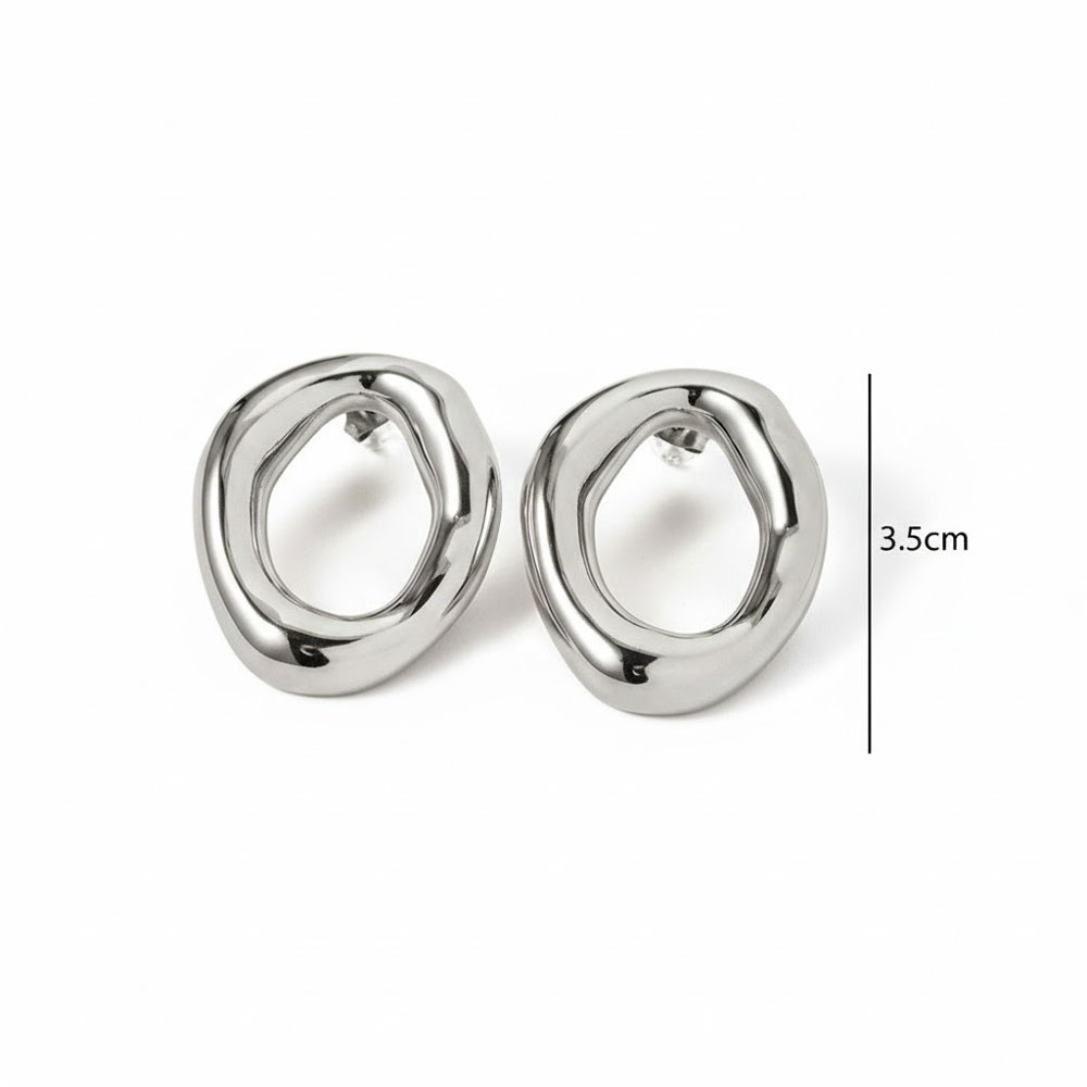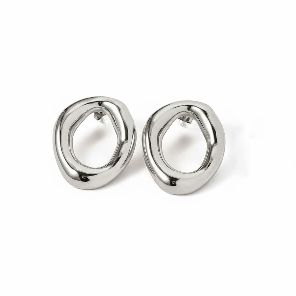 Μοντέρνα σκουλαρίκια από ανοξείδωτο ατσάλι σε “ρευστό”, ακανόνιστο οβάλ σχήμα που ακολουθεί τις τελευταίες τάσεις της μόδας. Η λεία, γυαλιστερή τους επιφάνεια αντανακλά το φως, προσφέροντας μια διακριτική αλλά πολυτελή λάμψη που αναδεικνύει κάθε πρόσωπο.