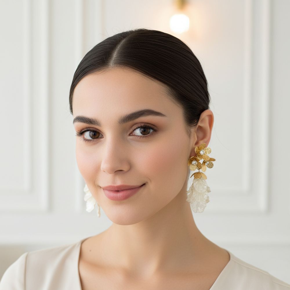 Εντυπωσιακά ατσάλινα σκουλαρίκια σε σχήμα λουλουδιού με λαμπερούς κρυστάλλους στο κέντρο και μαργαριταρένιες λεπτομέρειες που χαρίζουν κίνηση και φως. Ο συνδυασμός της σφυρήλατης χρυσής υφής με τη φίνα περλέ λάμψη δημιουργεί ένα εκλεπτυσμένο και θηλυκό αποτέλεσμα. Ιδανικά για ιδιαίτερες περιστάσεις ή βραδινές εμφανίσεις, προσφέρουν λάμψη, φινέτσα και αίσθηση πολυτέλειας. Ανθεκτικά, υποαλλεργικά και διαχρονικά.