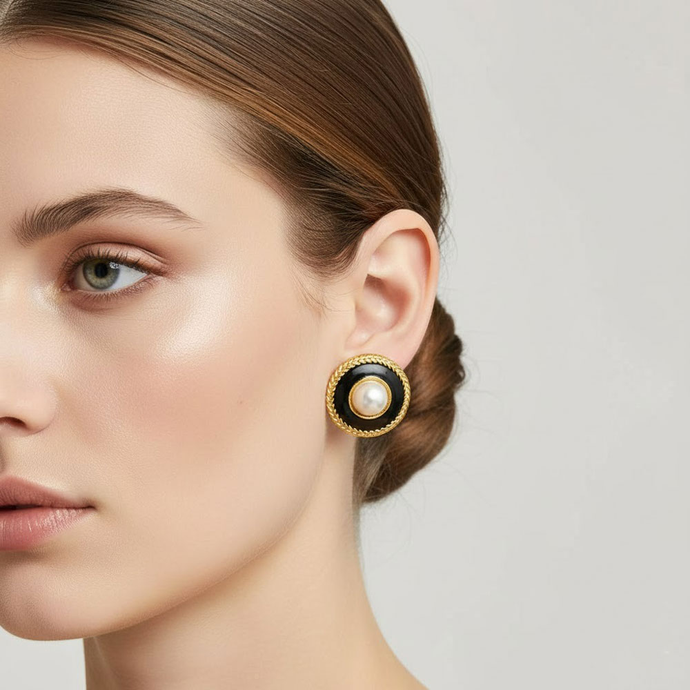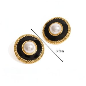 Ατσάλινα Στρογγυλά Σκουλαρίκια Μαύρη Βάση με Πέρλα Χρυσό Χρώμα