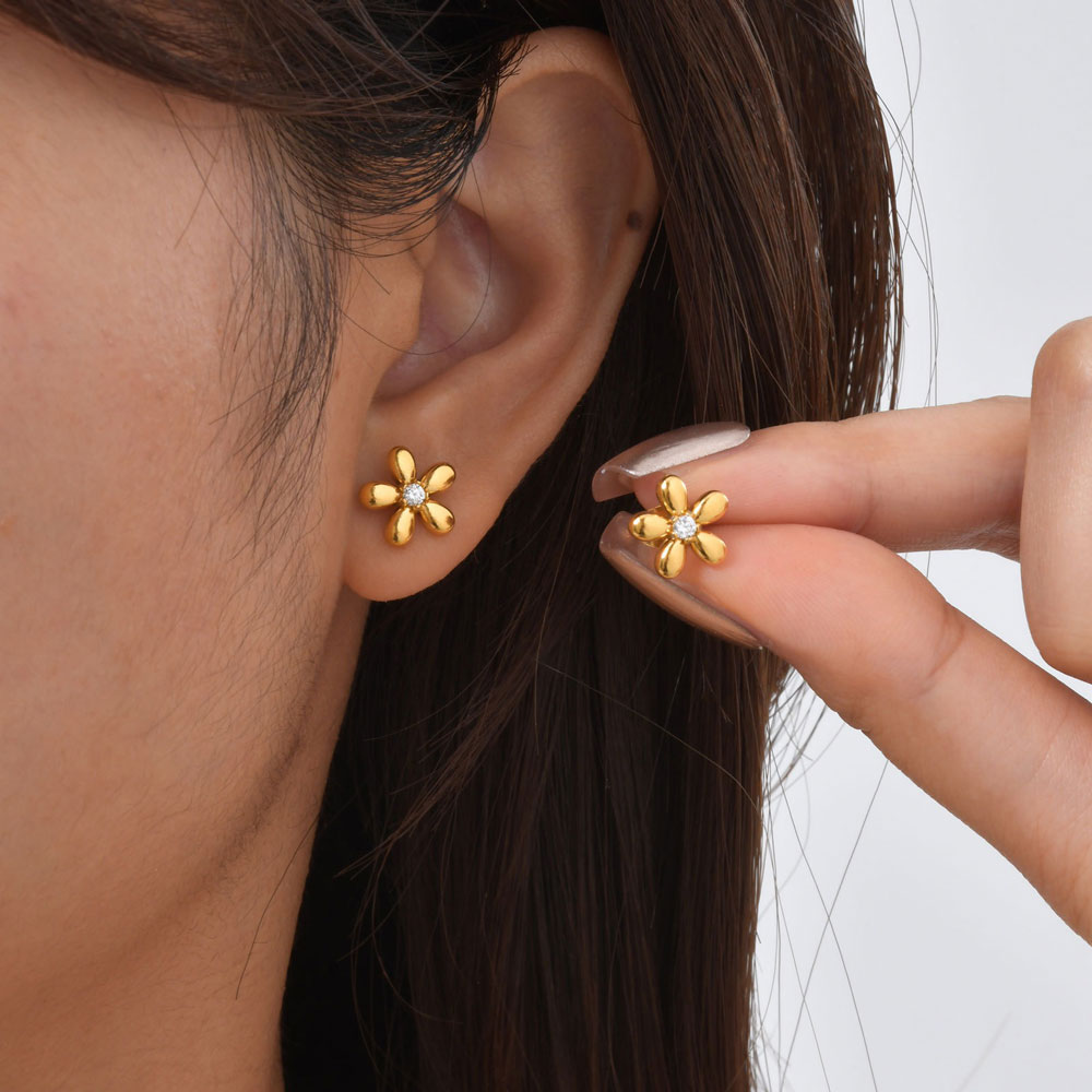 Κομψά καρφωτά σκουλαρίκια σε σχήμα λουλουδιού, κατασκευασμένα από ανοξείδωτο ατσάλι σε χρυσό χρώμα, με διακριτική κεντρική πέτρα που προσθέτει λάμψη και θηλυκή κομψότητα. Το ρομαντικό τους σχέδιο τα καθιστά ιδανική επιλογή για καθημερινή χρήση αλλά και για πιο προσεγμένες εμφανίσεις.Ελαφριά και άνετα στο αυτί, ανθεκτικά στη φθορά και υποαλλεργικά, με μέγεθος περίπου 1 cm, κατάλληλα για όλες τις ώρες. Υλικό:Ατσάλι