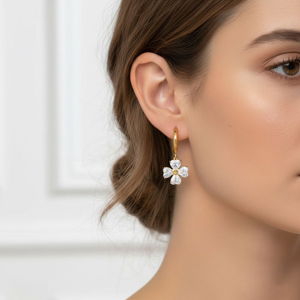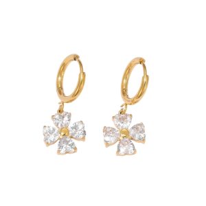 Κομψά σκουλαρίκια–κρίκοι από ανοξείδωτο ατσάλι με κρεμαστό λουλούδι στολισμένο με λαμπερούς κρυστάλλους. Λαμπερό και θηλυκό σχέδιο που αναδεικνύει κάθε εμφάνιση, ιδανικό για καθημερινές και πιο επίσημες περιστάσεις.
