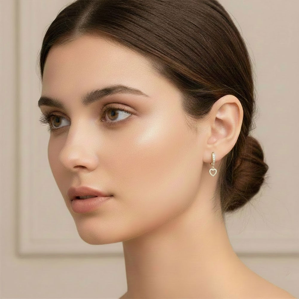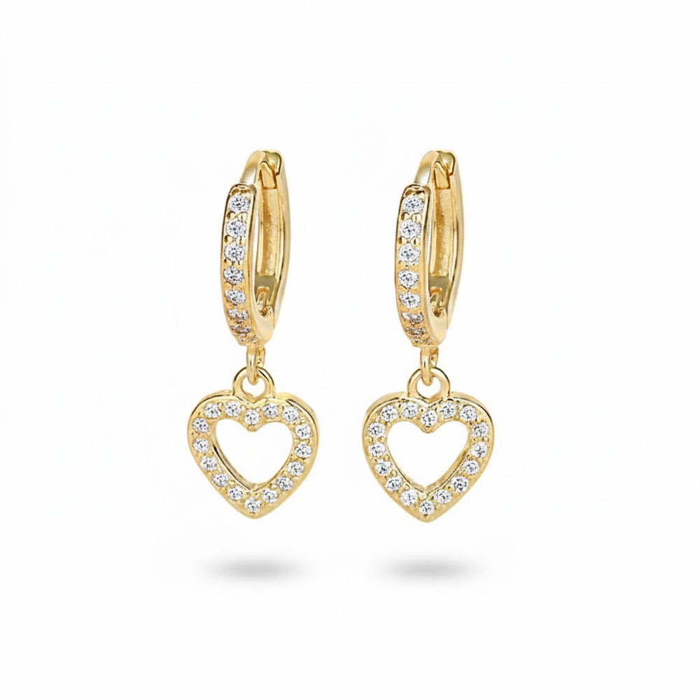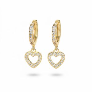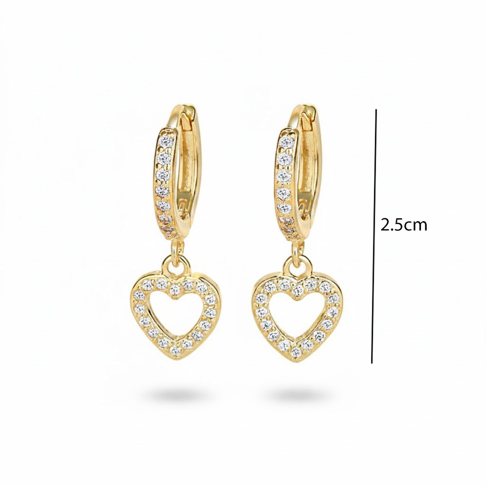 Κομψά σκουλαρίκια κρίκοι από ανοξείδωτο ατσάλι σε χρυσό χρώμα, με διακριτικό κρεμαστό μοτίφ μικρής καρδιάς διακοσμημένο με λαμπερές πέτρες που προσθέτουν φίνα λάμψη και ρομαντικό χαρακτήρα. Ελαφριά και άνετα στη χρήση, με ασφαλές κούμπωμα και μήκος περίπου 2,5 cm, ιδανικά για καθημερινές αλλά και πιο προσεγμένες εμφανίσεις.