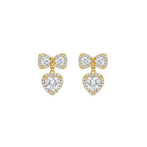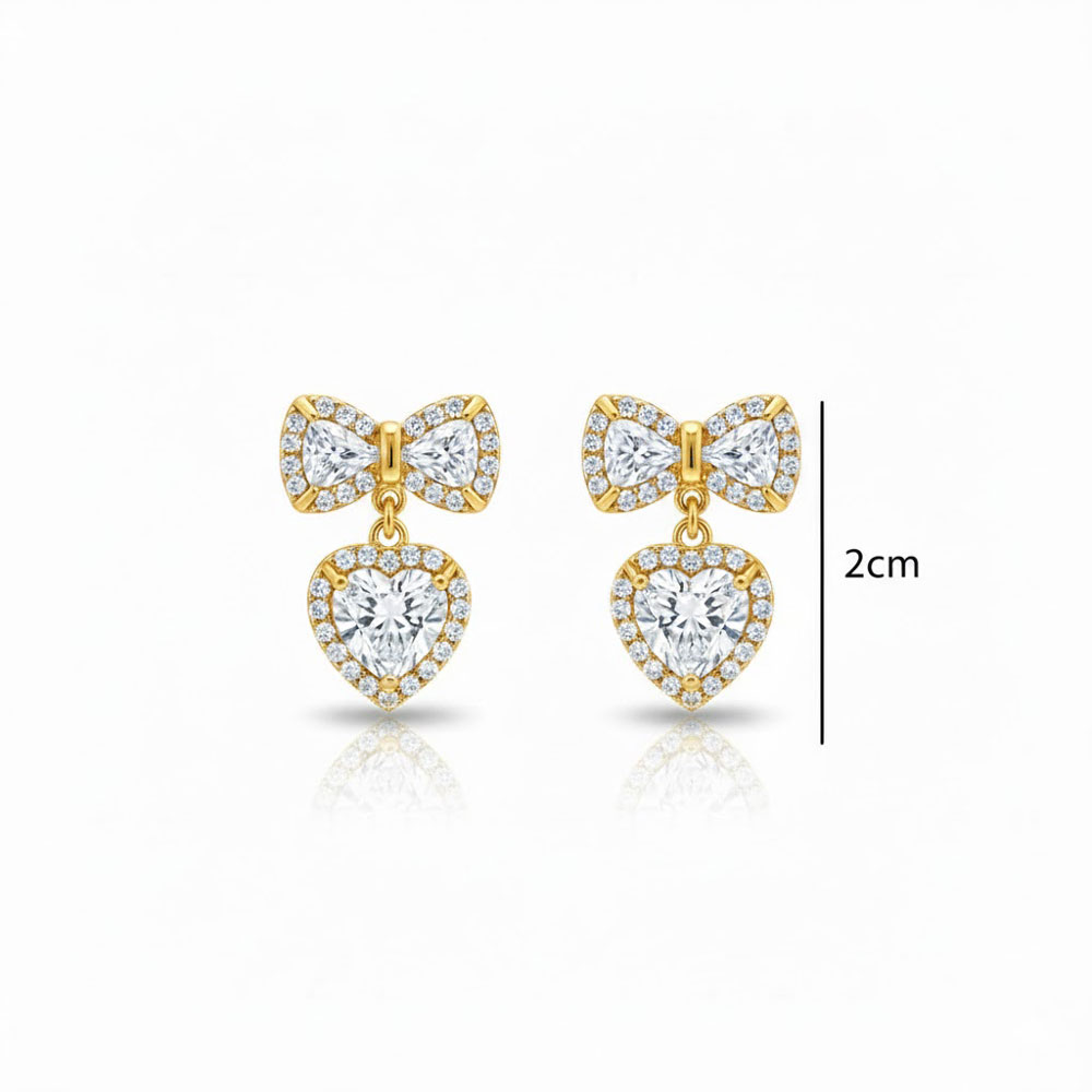 Κομψά σκουλαρίκια από ανοξείδωτο ατσάλι με διακριτικό φιόγκο και κρεμαστό μοτίφ καρδιάς, διακοσμημένα με λαμπερές λεπτομέρειες που προσθέτουν θηλυκότητα και γοητεία. Ιδανικά για elegant εμφανίσεις που θέλουν μια διακριτική αλλά εντυπωσιακή λάμψη.