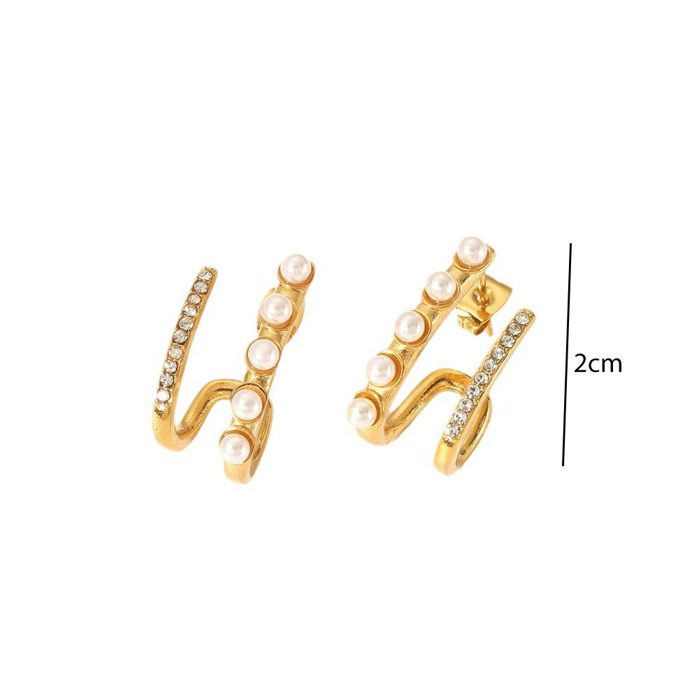 Κομψά σκουλαρίκια από ανοξείδωτο ατσάλι με μοντέρνο, καμπυλωτό σχέδιο που αγκαλιάζει διακριτικά το αυτί. Διακοσμημένα με λευκές πέρλες και λαμπερά κρύσταλλα, προσφέρουν εκλεπτυσμένη λάμψη και θηλυκό χαρακτήρα. Ελαφριά και άνετα στην εφαρμογή, συνδυάζονται ιδανικά με minimal ή πιο εντυπωσιακά σύνολα, προσθέτοντας elegant πινελιά σε καθημερινές και βραδινές εμφανίσεις.