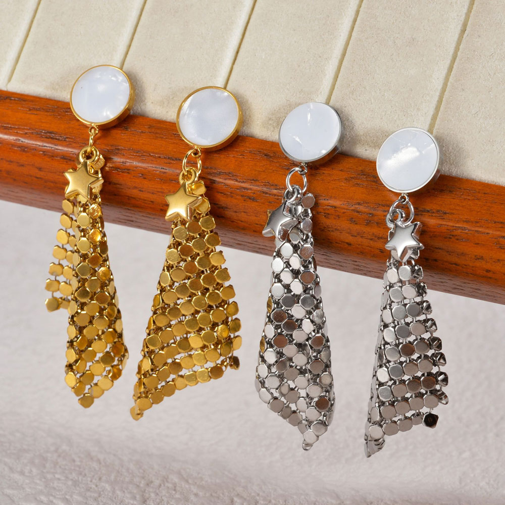 Κομψά κρεμαστά σκουλαρίκια από ανοξείδωτο ατσάλι, με φιλντισένιο στοιχείο στο επάνω μέρος και διακριτικό αστέρι που προσθέτει μια παιχνιδιάρικη αλλά εκλεπτυσμένη πινελιά. Ο ανάλαφρος σχεδιασμός τους χαρίζει κίνηση και λάμψη, καθιστώντας τα ιδανικά για ιδιαίτερες εμφανίσεις από το πρωί έως το βράδυ. Ανθεκτικά στη χρήση και άνετα στην εφαρμογή.