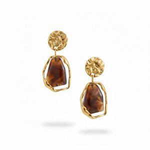 Ατσάλινα Κρεμαστά Σκουλαρίκια με Γεωμετρική Τσαλακωμένη Υφή Και Πέτρα Χρυσό με Καφέ ΧρώμαA3408