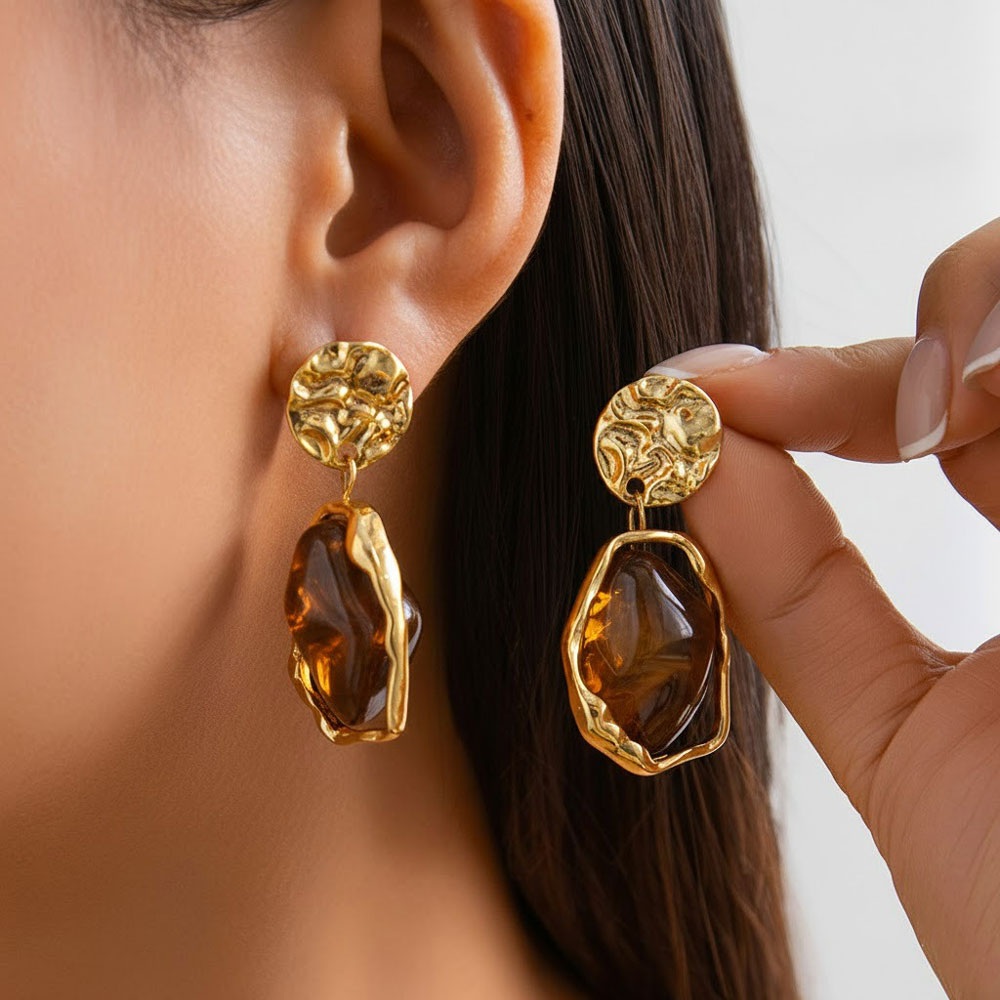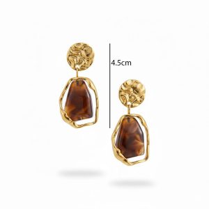 • Ατσάλινα Κρεμαστά Σκουλαρίκια με Γεωμετρική Τσαλακωμένη Υφή Και Πέτρα Χρυσό με Καφέ ΧρώμαA3408