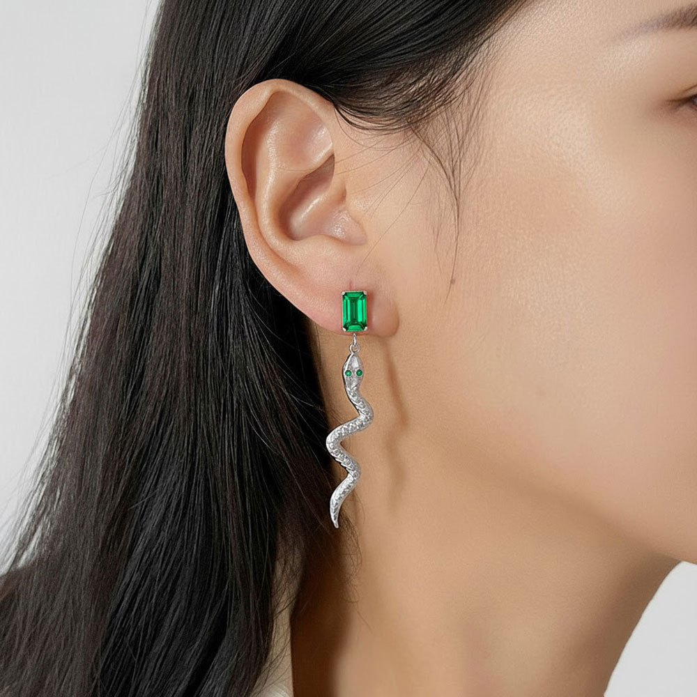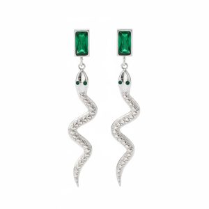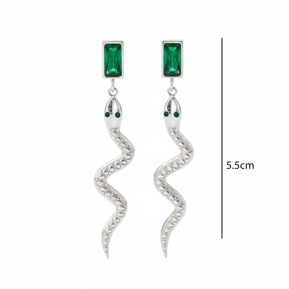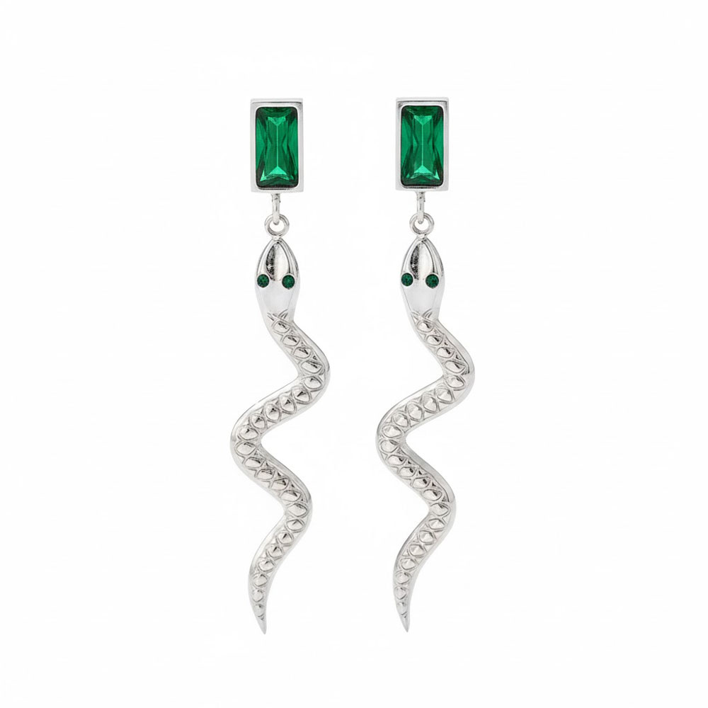 Εντυπωσιακά σκουλαρίκια από ανοξείδωτο ατσάλι σε ασημί χρώμα, με ιδιαίτερο σχέδιο φιδιού και λαμπερό ορθογώνιο πράσινο κρύσταλλο στο επάνω μέρος, που προσθέτει ένταση και πολυτελή χαρακτήρα στο σύνολο. Το ανάγλυφο σώμα και η κομψή, κυματιστή γραμμή τους δημιουργούν ένα statement κόσμημα με μοντέρνα και δυναμική αισθητική. Ιδανικά για να αναβαθμίσουν τόσο καθημερινά όσο και βραδινά looks. Ανθεκτικά, υποαλλεργικά και άνετα στη χρήση, με συνολικό μήκος περίπου 5.5 cm.