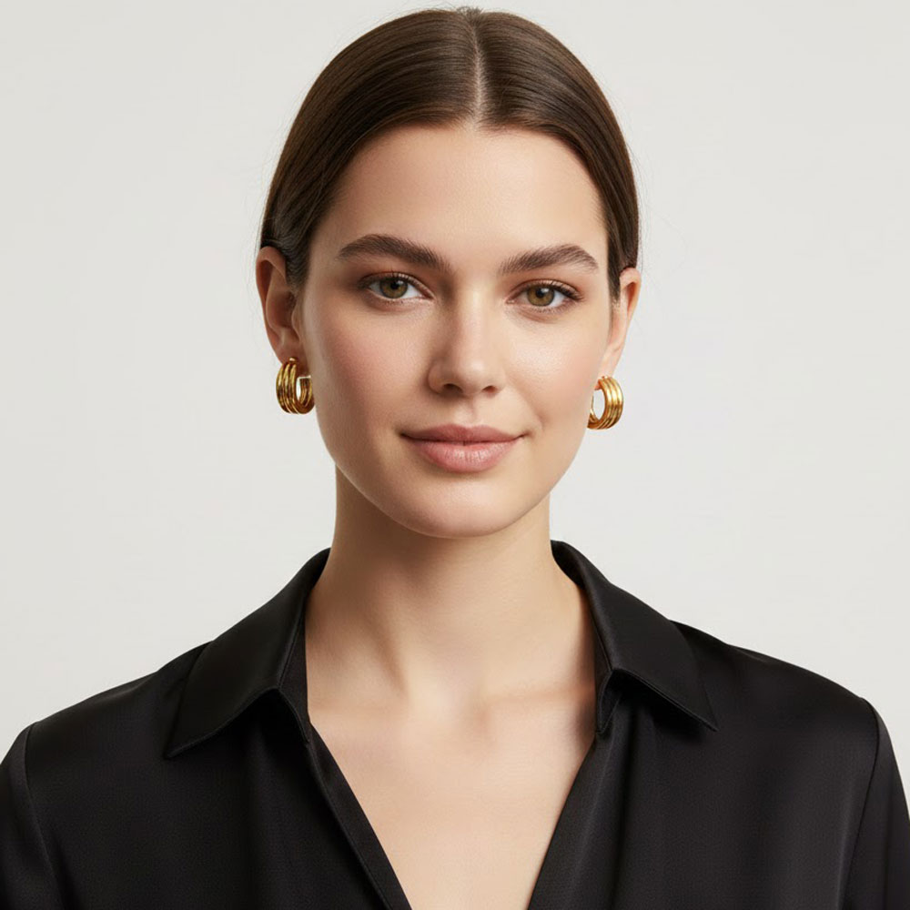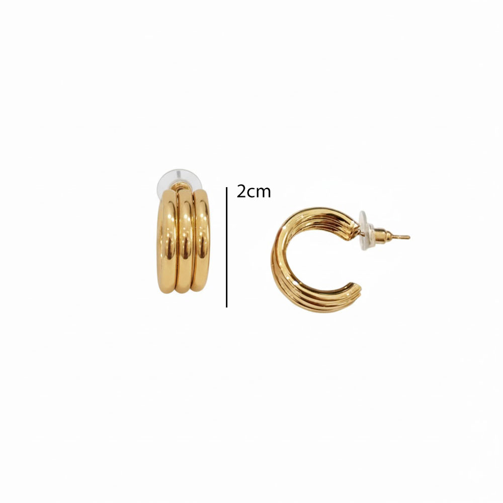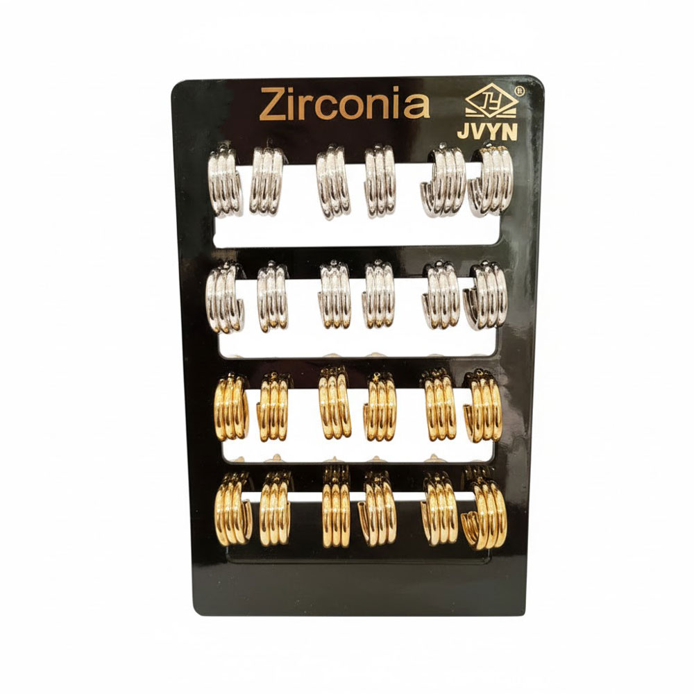 Κομψό σετ 12 ζευγών σκουλαρικιών κρίκων με μοντέρνο σχέδιο τριπλής σειράς, ιδανικό για καθημερινές αλλά και πιο ιδιαίτερες εμφανίσεις. Ελαφριά, άνετα στο αυτί και διαθέσιμα σε χρυσό και ασημί χρώμα, αποτελούν υπέροχη επιλογή για να εμπλουτίσετε τη συλλογή των αξεσουάρ σας.