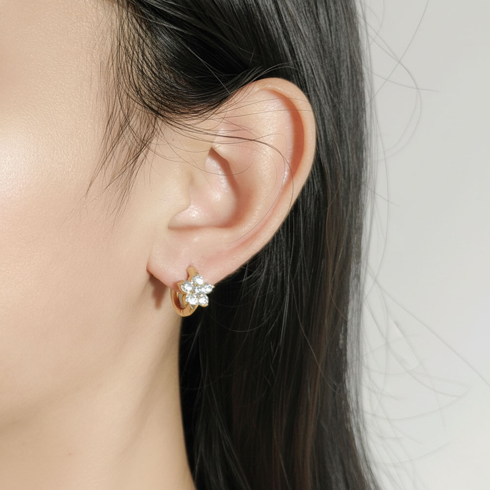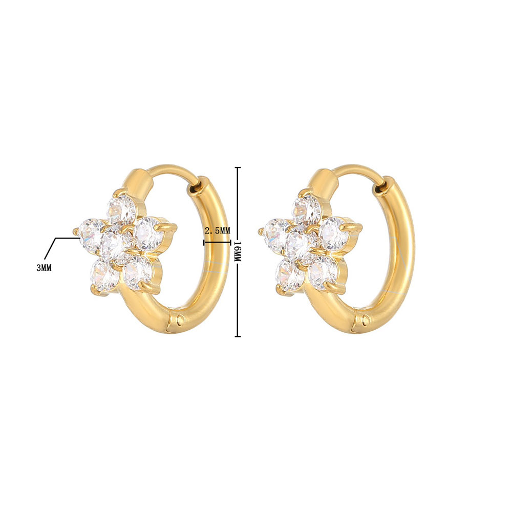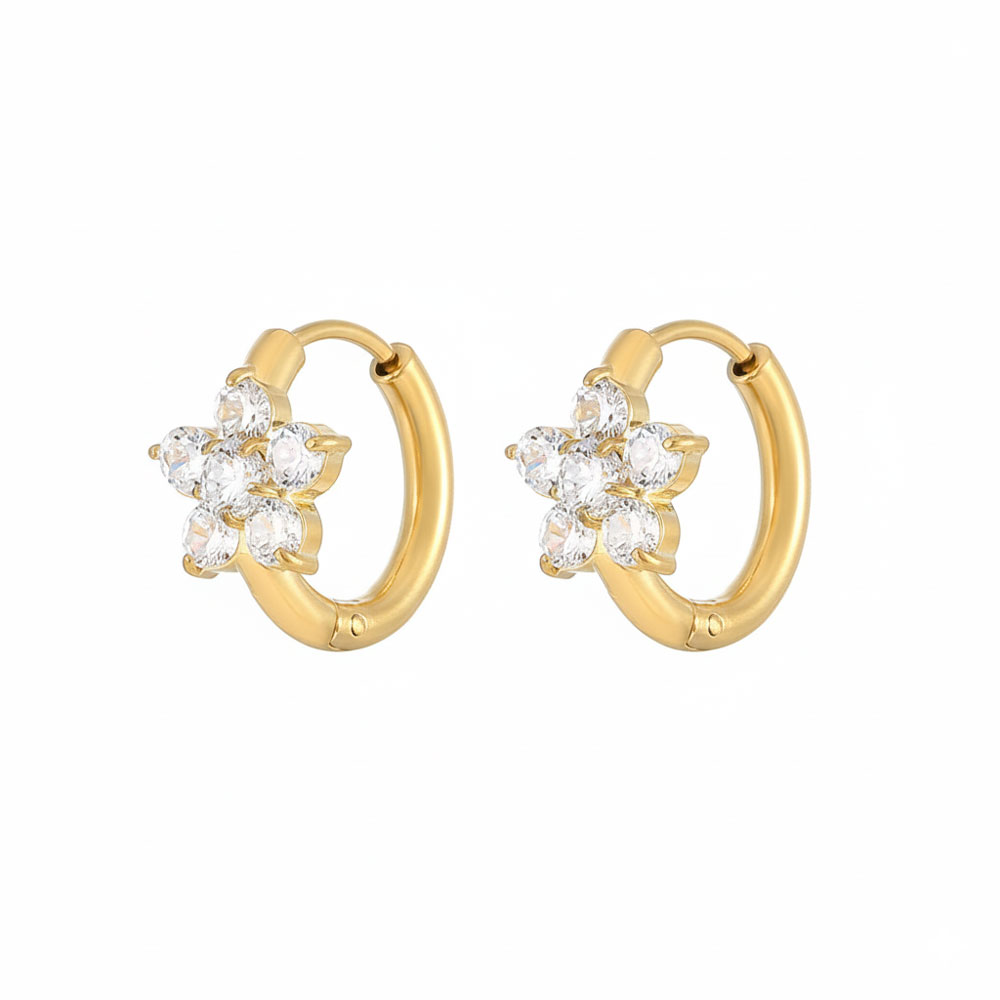 Μικροί χρυσοί κρίκοι από ατσάλι, διακοσμημένοι με λαμπερή λευκή πέτρα σε σχέδιο λουλουδιού. Κομψά, φωτεινά και ιδανικά για καθημερινή χρήση αλλά και για πιο προσεγμένες εμφανίσεις. Ελαφριά και άνετα, με διάμετρο περίπου 1,6 cm, προσθέτουν μια διακριτική λάμψη και θηλυκότητα σε κάθε look.