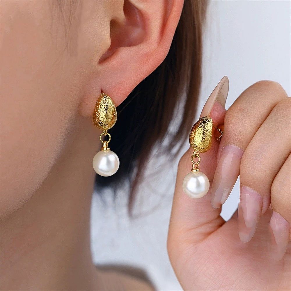Κομψά σκουλαρίκια από ανοξείδωτο ατσάλι με εντυπωσιακή σφυρήλατη υφή και κρεμαστή πέρλα που χαρίζει διακριτική λάμψη. Το μοντέρνο αλλά ταυτόχρονα κλασικό τους σχέδιο τα καθιστά ιδανική επιλογή για καθημερινές εμφανίσεις ή πιο επίσημες περιστάσεις. Ελαφριά, υποαλλεργικά και άνετα στη χρήση, προσθέτουν μια elegant πινελιά σε κάθε σύνολο. Υλικό:Ατσάλι
