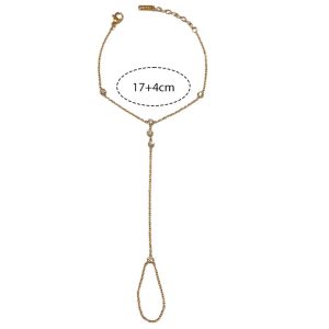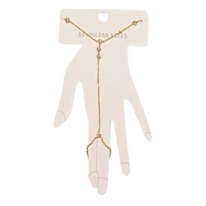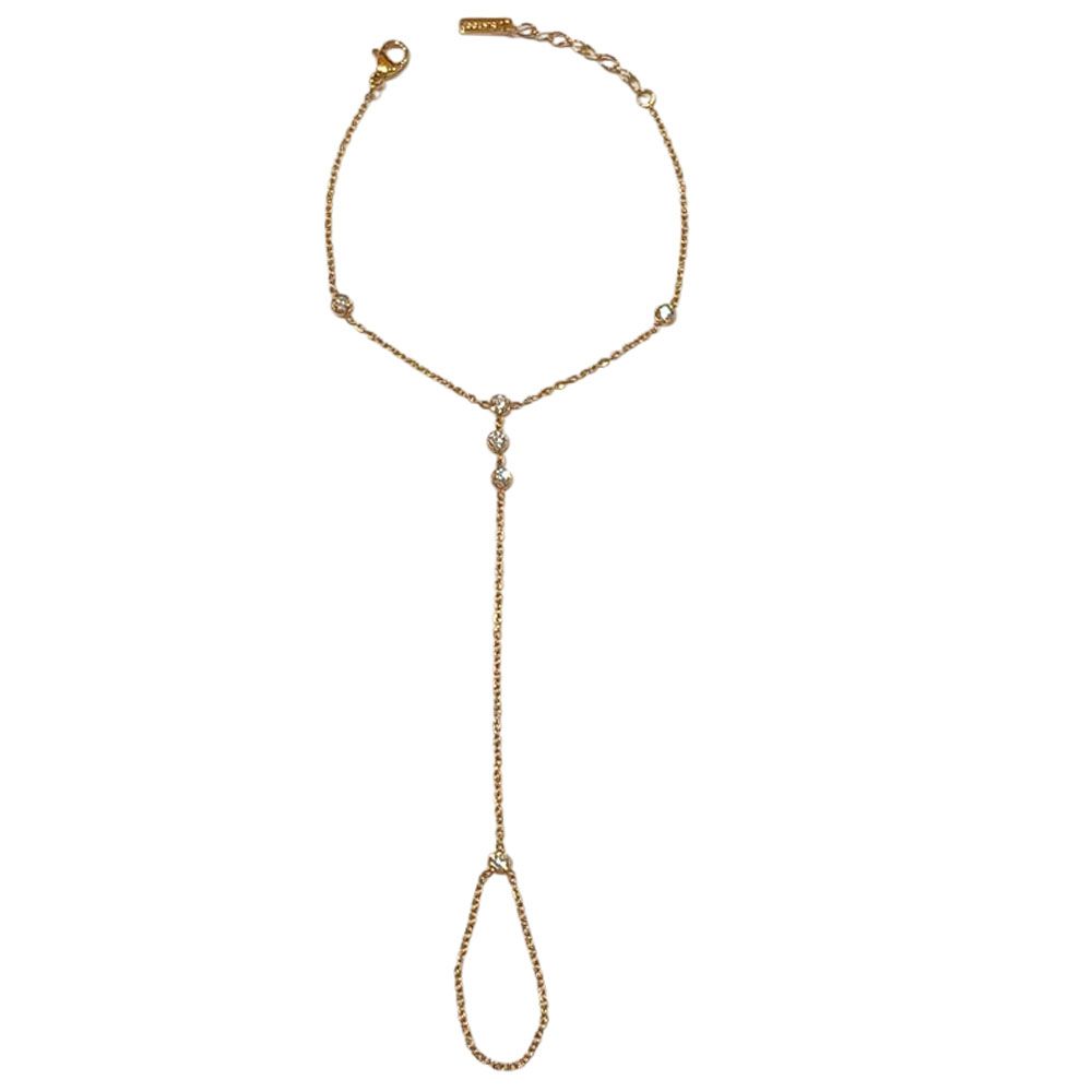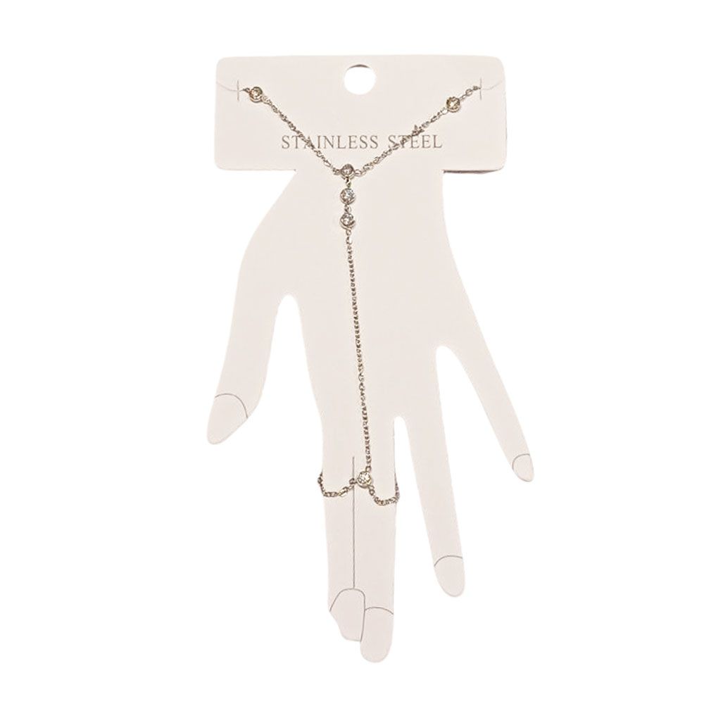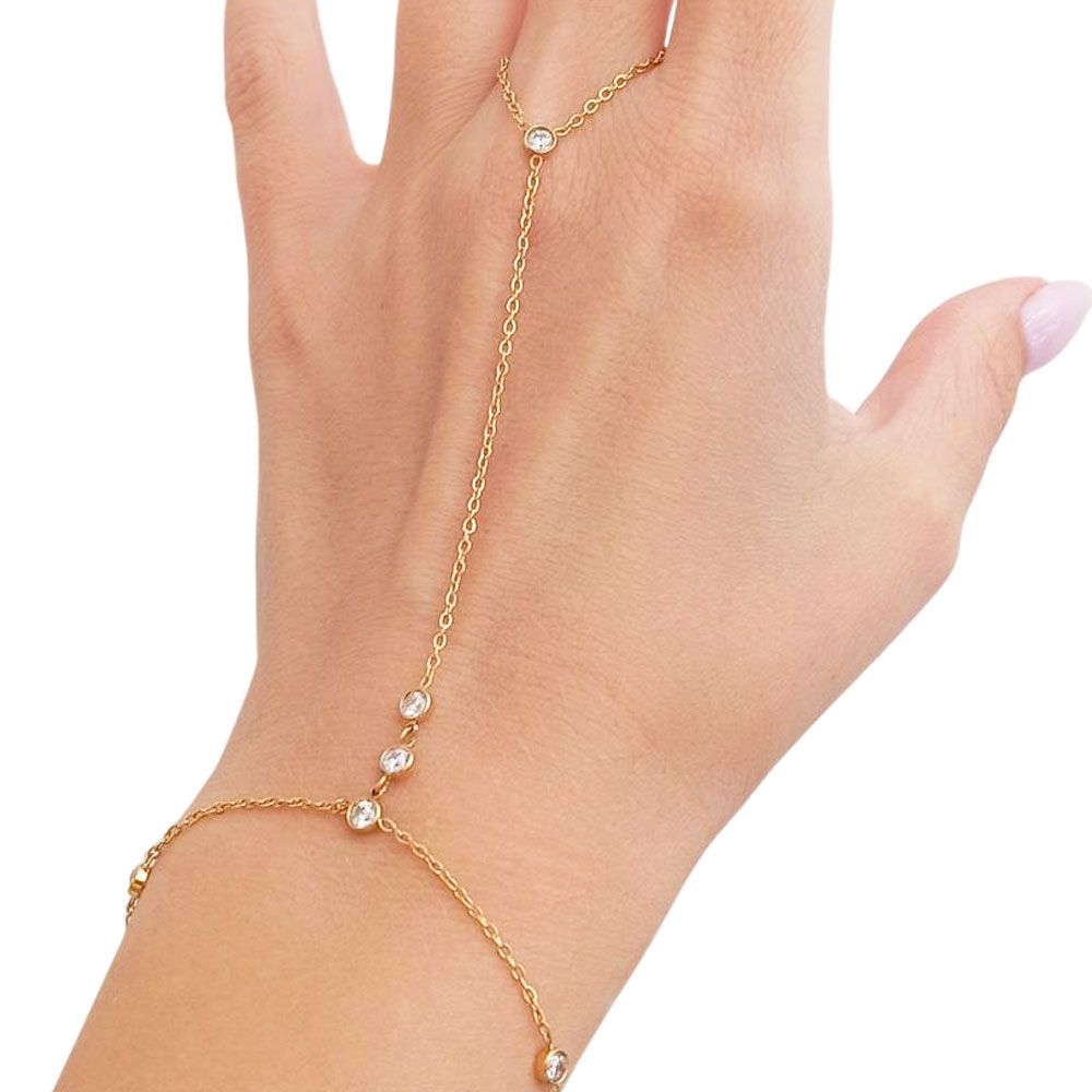 Κομψό βραχιόλι δαχτυλίδι από ανοξείδωτο ατσάλι, διακοσμημένο με λαμπερά λευκά κρύσταλλα που χαρίζουν διακριτική λάμψη σε κάθε σας εμφάνιση. Ο λεπτός του σχεδιασμός αγκαλιάζει το χέρι και το δάχτυλο, δημιουργώντας ένα μοναδικό και θηλυκό στυλ. Ιδανικό για να φορεθεί σε βραδινές εξόδους ή ειδικές περιστάσεις. Διατίθεται σε χρυσό και ασημί χρώμα.