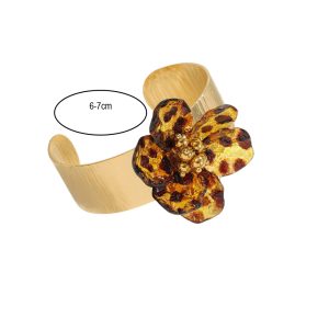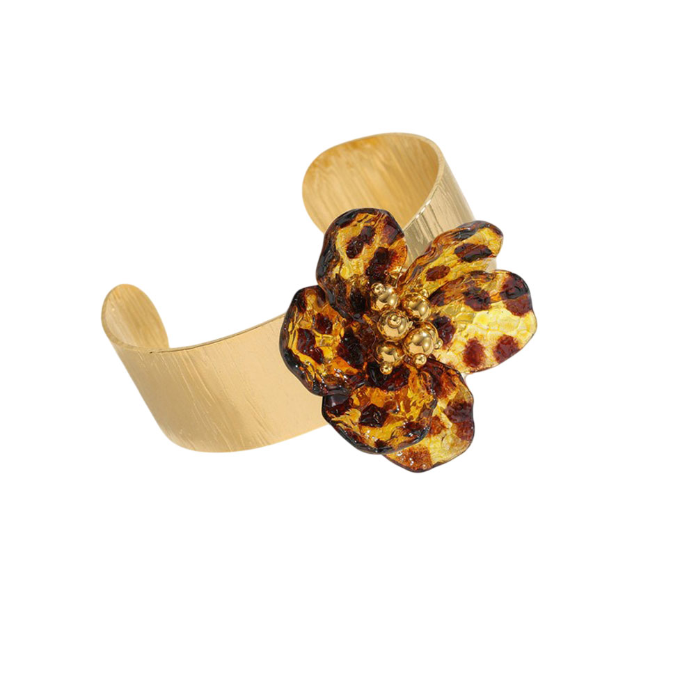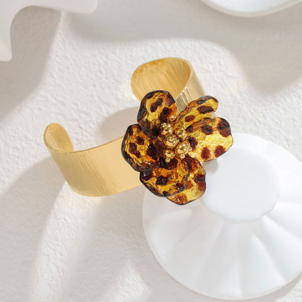 Εντυπωσιακό χειροπέδα βραχιόλι από ανοξείδωτο ατσάλι με φαρδιά μεταλλική βάση σε χρυσό τόνο και διακοσμητικό λουλούδι στο κέντρο. Το λουλούδι ξεχωρίζει με σμάλτο σε animal print αποχρώσεις και ανάγλυφες χρυσές λεπτομέρειες, δημιουργώντας ένα statement αποτέλεσμα με καλλιτεχνικό χαρακτήρα. Ανοιχτό και ρυθμιζόμενο για άνετη εφαρμογή, φοριέται εύκολα και αναβαθμίζει κάθε εμφάνιση, από minimal έως πιο ιδιαίτερα looks. Ιδανικό για όσες αγαπούν τα τολμηρά και μοναδικά κοσμήματα.