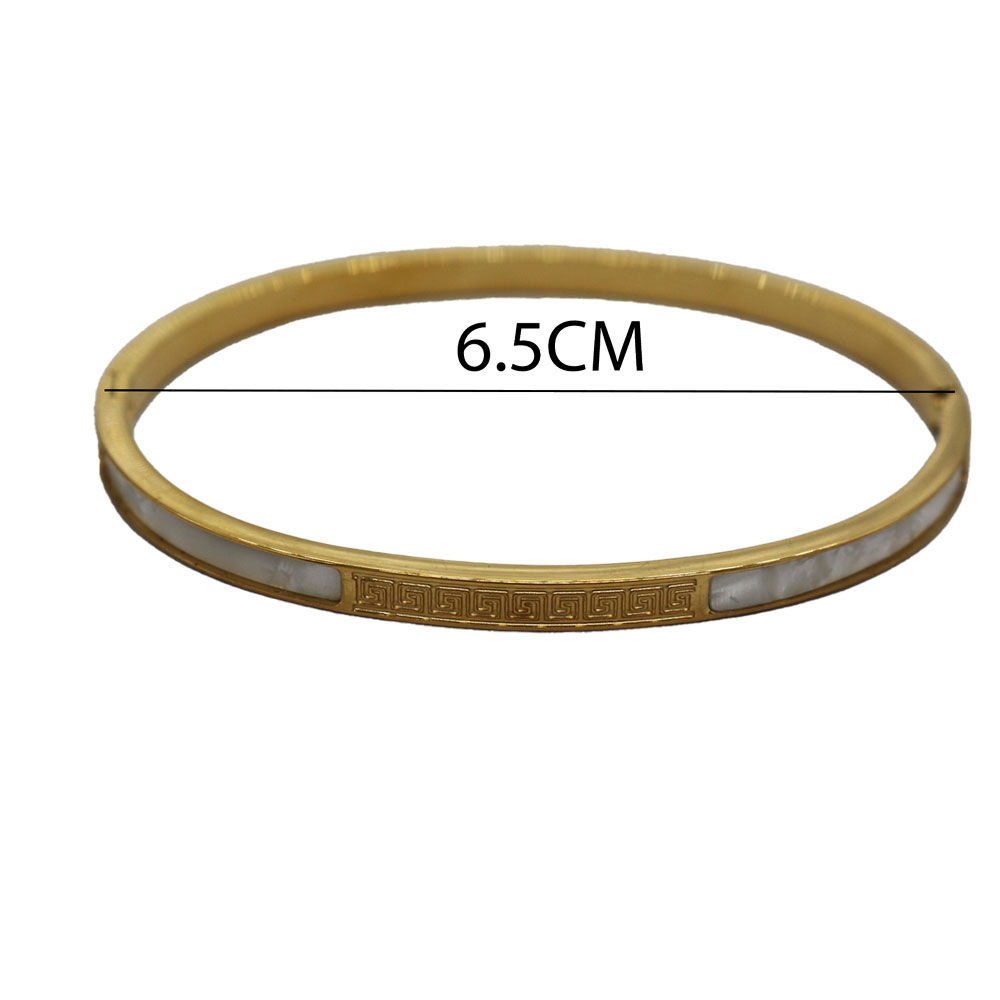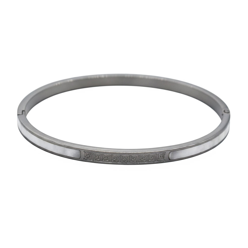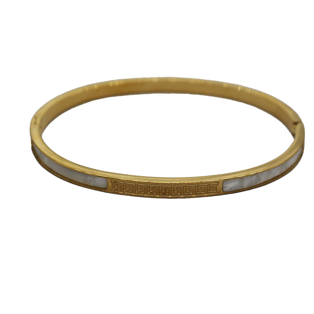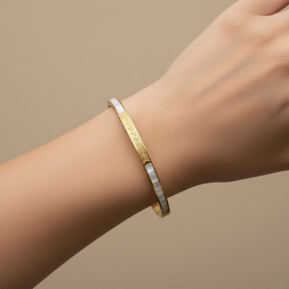 Κομψό και διαχρονικό βραχιόλι από ανοξείδωτο ατσάλι, διακοσμημένο με λωρίδες μαργαριτοκέλυφου και το κλασικό μοτίβο του Μαιάνδρου. Το σύμβολο αυτό αντιπροσωπεύει την αιωνιότητα και τη συνέχεια, προσθέτοντας μια νότα ελληνικής πολιτιστικής ταυτότητας στο κόσμημα. Λεπτό, μοντέρνο και ανθεκτικό—ιδανικό τόσο για καθημερινό στιλ όσο και για επίσημες εμφανίσεις.