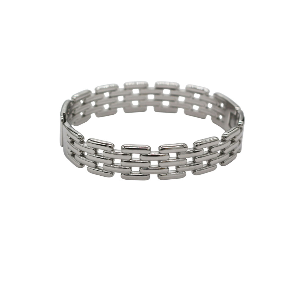 Κομψό βραχιόλι από ανοξείδωτο ατσάλι, σε ιδιαίτερη επίπεδη πλέξη τύπου block-link που χαρίζει μοντέρνα και καθαρή γραμμή. Η στιβαρή αλλά διακριτική σχεδίασή του το κάνει ιδανικό για καθημερινή χρήση, αλλά και για πιο προσεγμένες εμφανίσεις.Ανθεκτικό, δεν μαυρίζει και διατηρεί τη λάμψη του στον χρόνο. Φοριέται μόνο του ή μαζί με άλλα βραχιόλια για πιο δυναμικό look.