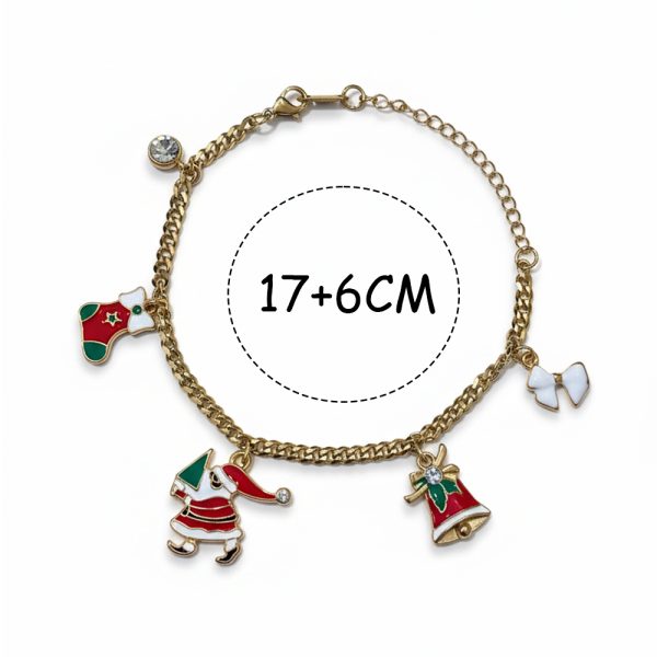 Γιορτινό ατσάλινο βραχιόλι με χαριτωμένα charms – Άγιο Βασίλη, κάλτσα, καμπάνα και φιόγκο. Ένα παιχνιδιάρικο και λαμπερό κόσμημα που αποπνέει τη μαγεία των Χριστουγέννων. Κατασκευασμένο από ανοξείδωτο ατσάλι με πολύχρωμες λεπτομέρειες σμάλτου και χρυσή απόχρωση που προσφέρει κομψότητα και ανθεκτικότητα.