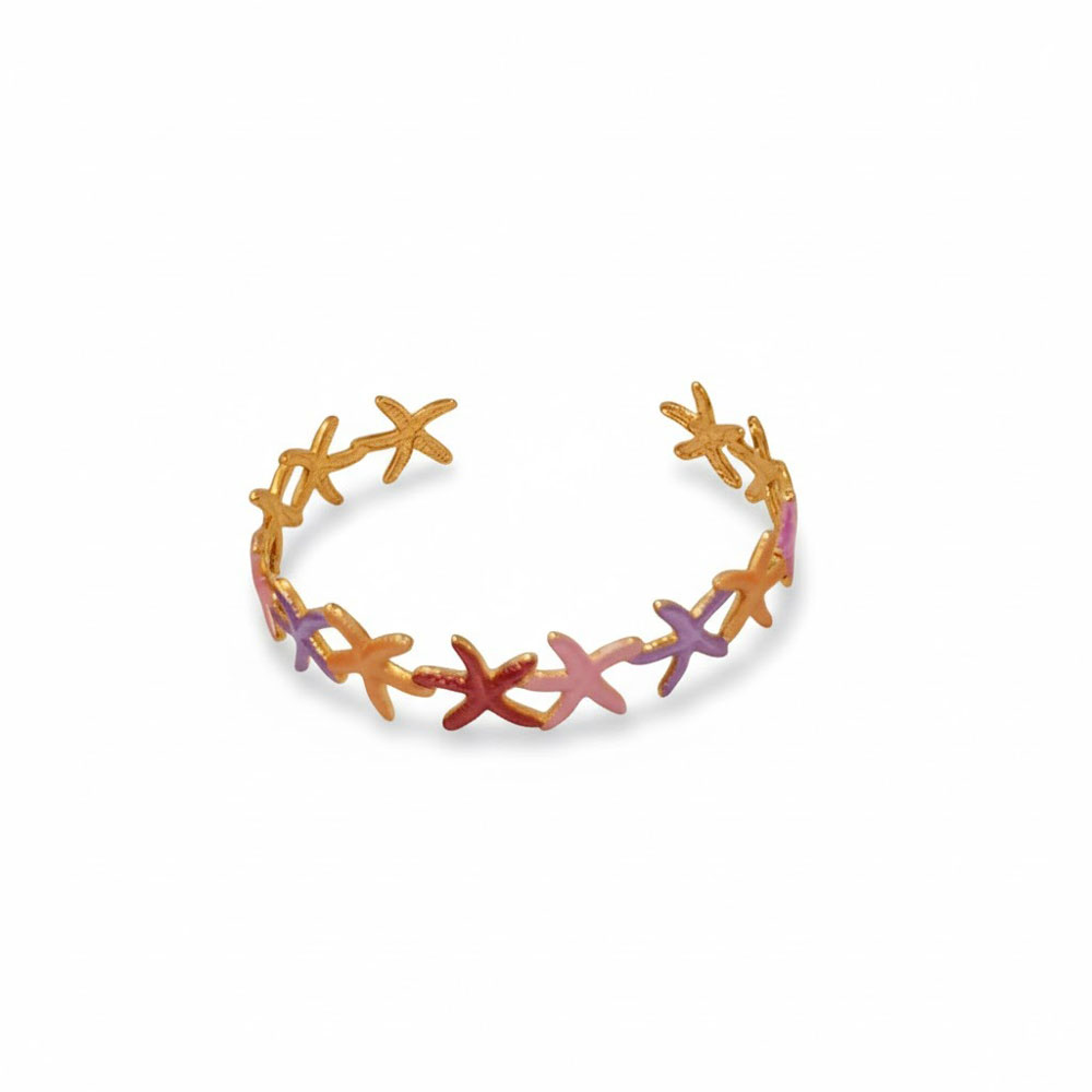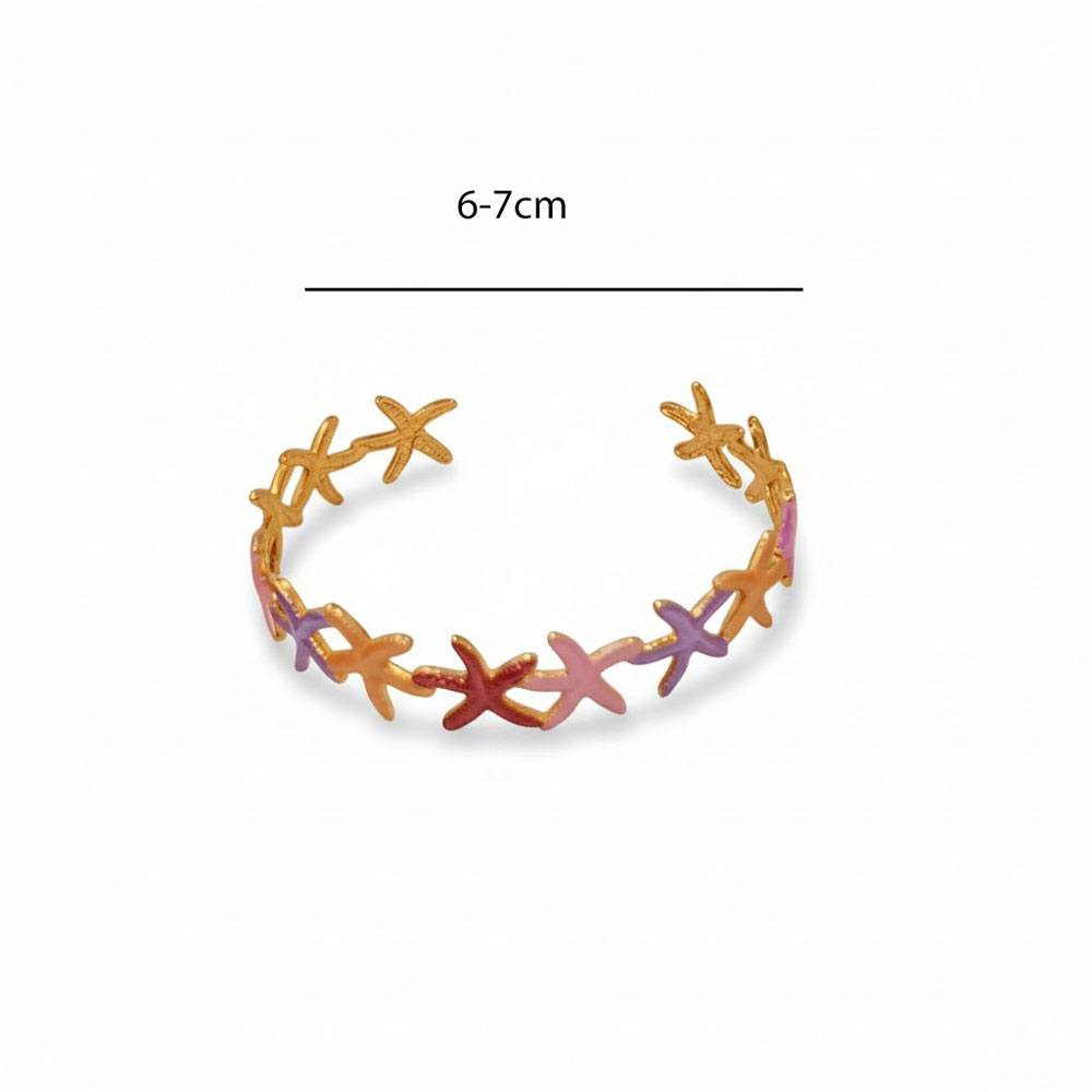 Χαρούμενο και καλοκαιρινό χειροπέδα βραχιόλι από ανοξείδωτο ατσάλι, διακοσμημένο με πολύχρωμους αστερίες που χαρίζουν παιχνιδιάρικο και φρέσκο χαρακτήρα. Ο ανάλαφρος σχεδιασμός του αποπνέει καλοκαιρινή διάθεση και θαλασσινή έμπνευση.
