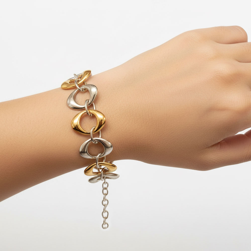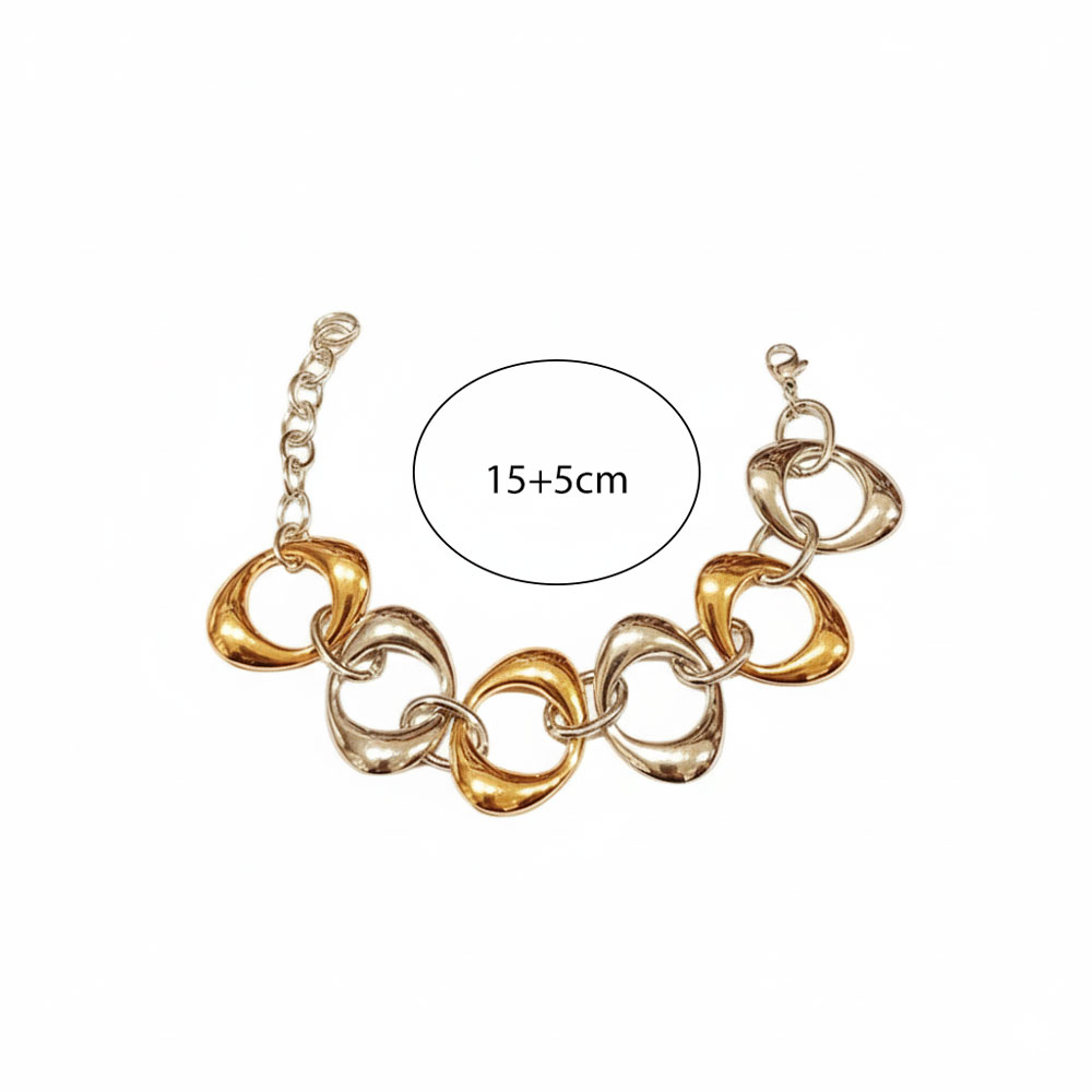 Εντυπωσιακό δίχρωμο βραχιόλι με μεγάλους, καμπυλωτούς κρίκους σε χρυσό και ασημί χρώμα. Ο μοντέρνος σχεδιασμός του δίνει μια statement αισθητική που ξεχωρίζει σε κάθε εμφάνιση. Ρυθμιζόμενο μήκος 15+5 cm για άνετη εφαρμογή. Ιδανικό για καθημερινό στιλ αλλά και για πιο ιδιαίτερες περιστάσεις.