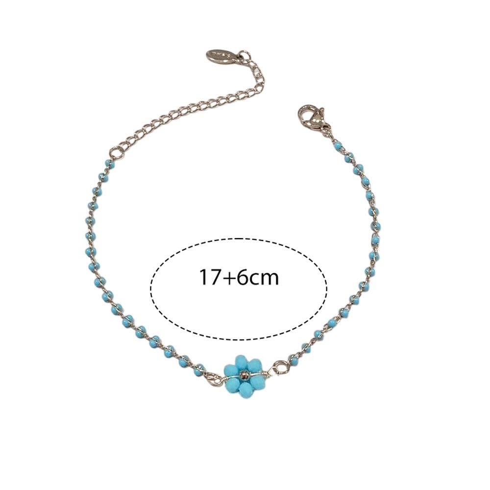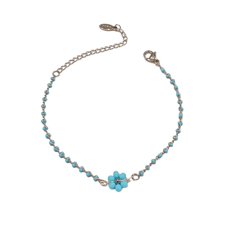 Κομψό βραχιόλι από ανοξείδωτο ατσάλι, διακοσμημένο με μικρές χάντρες και κεντρικό μπλε λουλούδι. Ιδανικό για να προσθέσει μια δροσερή και καλοκαιρινή πινελιά σε κάθε σας εμφάνιση. Διαθέτει αλυσίδα προέκτασης για άνετη εφαρμογή και μπορεί να φορεθεί μόνο του ή σε συνδυασμό με άλλα βραχιόλια.
