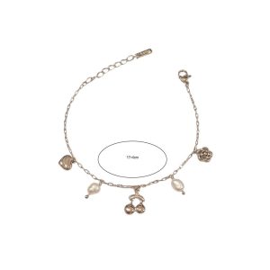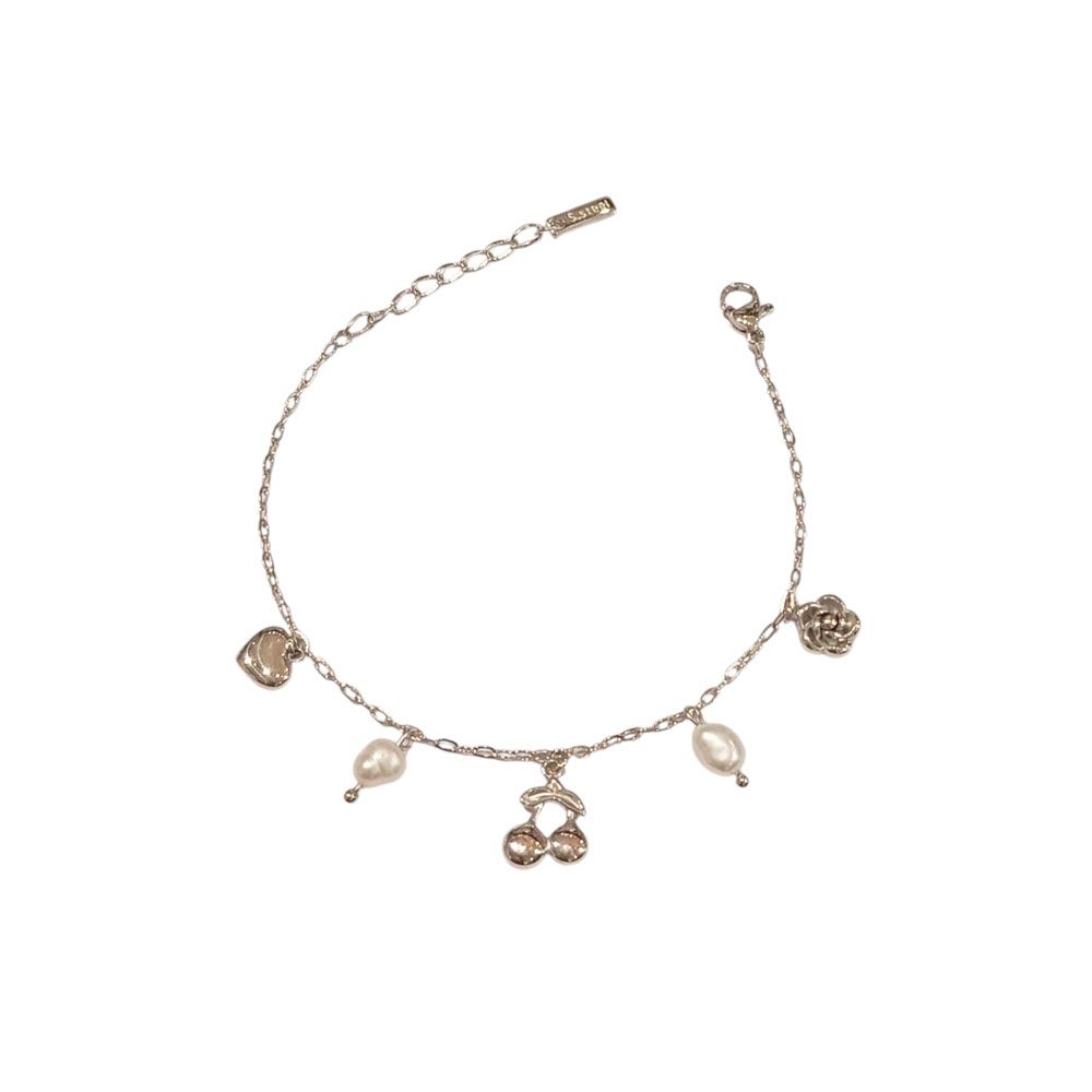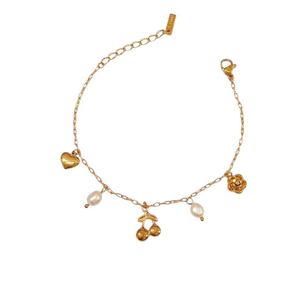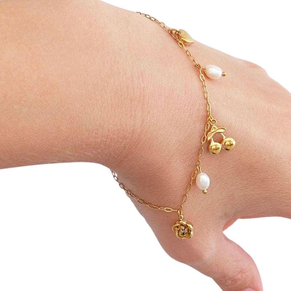 Κομψό βραχιόλι με λεπτή αλυσίδα και διακοσμητικά charms σε σχήμα καρδιάς, κερασιού, τριαντάφυλλου και μαργαριταριών. Διαθέσιμο σε χρυσή και ασημί απόχρωση, ιδανικό για να χαρίσει μια ρομαντική και παιχνιδιάρικη νότα σε κάθε εμφάνιση.