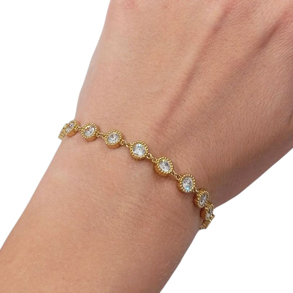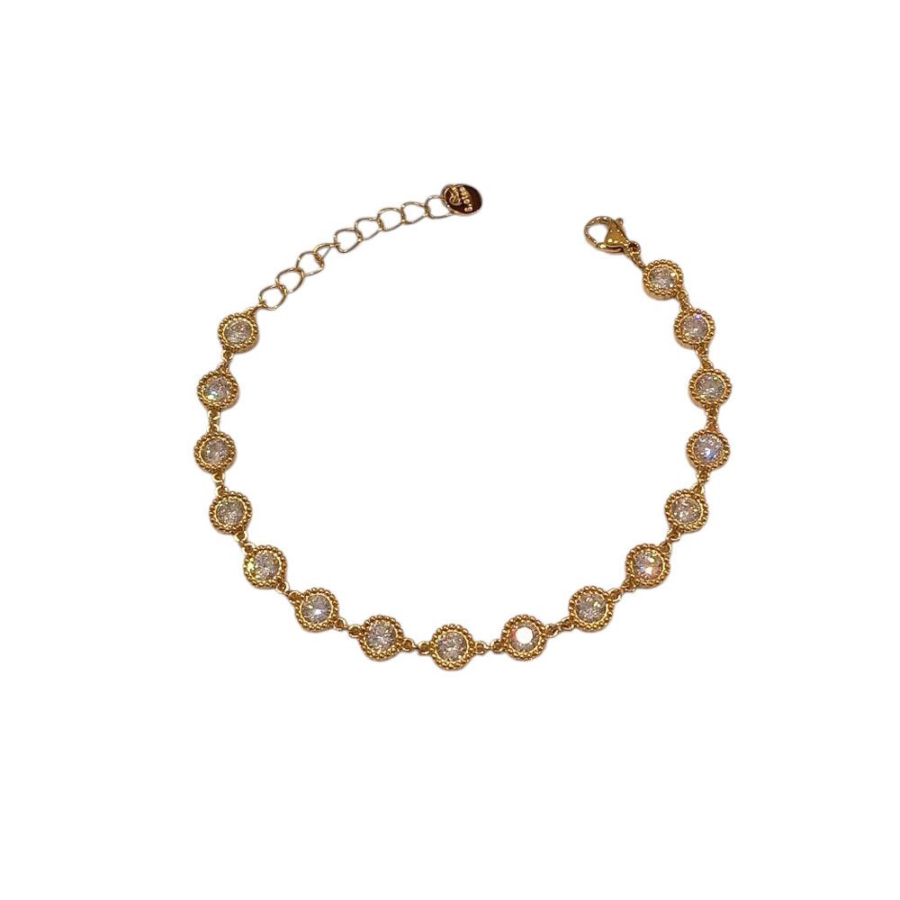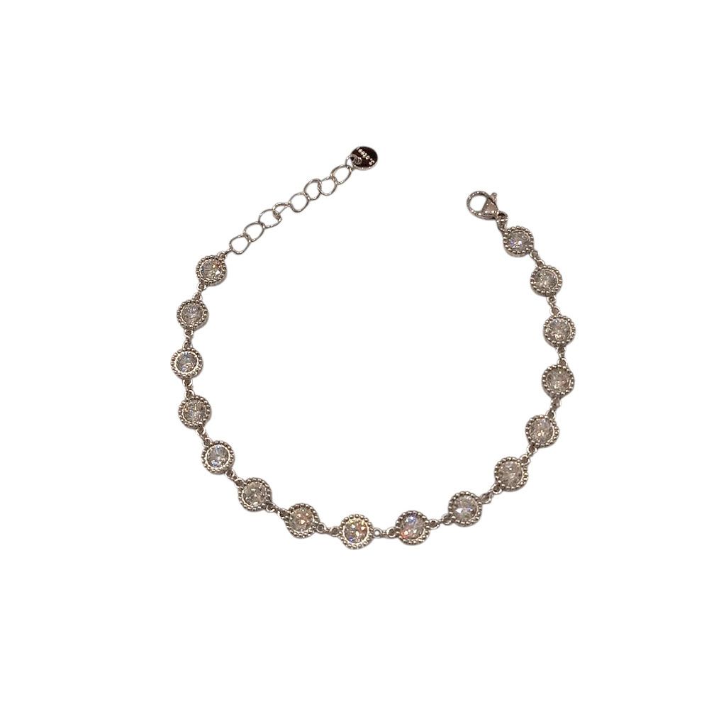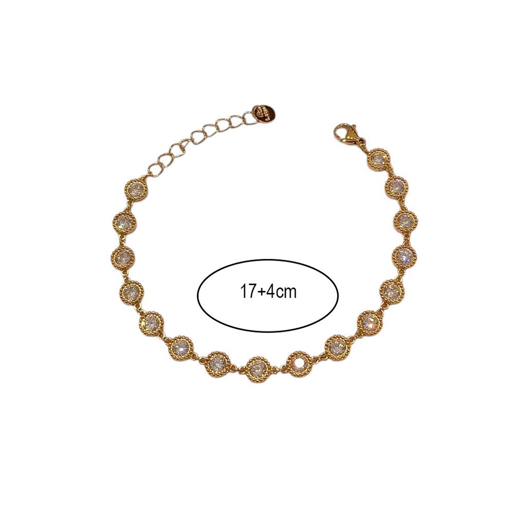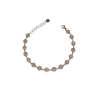 Κομψό βραχιόλι με σειρά από κυκλικά στοιχεία διακοσμημένα με λευκές πέτρες, που προσθέτουν λάμψη και διαχρονική φινέτσα. Διατίθεται σε χρυσό και ασημί χρώμα, ιδανικό για να συνοδεύει κάθε σας εμφάνιση.