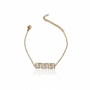 Κομψό γυναικείο βραχιόλι σε χρυσή απόχρωση με διαχρονικό σχέδιο μαίανδρου, διακοσμημένο με λαμπερά στρας που προσθέτουν διακριτική λάμψη και πολυτέλεια. Κατασκευασμένο από ανθεκτικό ανοξείδωτο ατσάλι, διαθέτει λεπτή αλυσίδα και πρακτικό κούμπωμα με προέκταση για άνετη και ρυθμιζόμενη εφαρμογή στο χέρι (16+5cm). Ιδανική επιλογή για καθημερινή χρήση αλλά και για πιο επίσημες εμφανίσεις, προσφέροντας μια elegant πινελιά με ελληνική αισθητική.