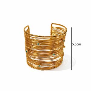 Εντυπωσιακή χειροπέδα από ατσάλινο σύρμα σε χρυσή απόχρωση, με πολυπλεκτό σχέδιο και διακοσμητικά ματάκια σε τιρκουάζ τόνους που χαρίζουν μοντέρνο και προστατευτικό χαρακτήρα. Ο ανοιχτός σχεδιασμός επιτρέπει άνετη και εύκολη προσαρμογή στον καρπό, ενώ η ελαφριά αλλά σταθερή κατασκευή την καθιστά ιδανική για καθημερινή χρήση και ιδιαίτερες εμφανίσεις. Ύψος 5,5cm.