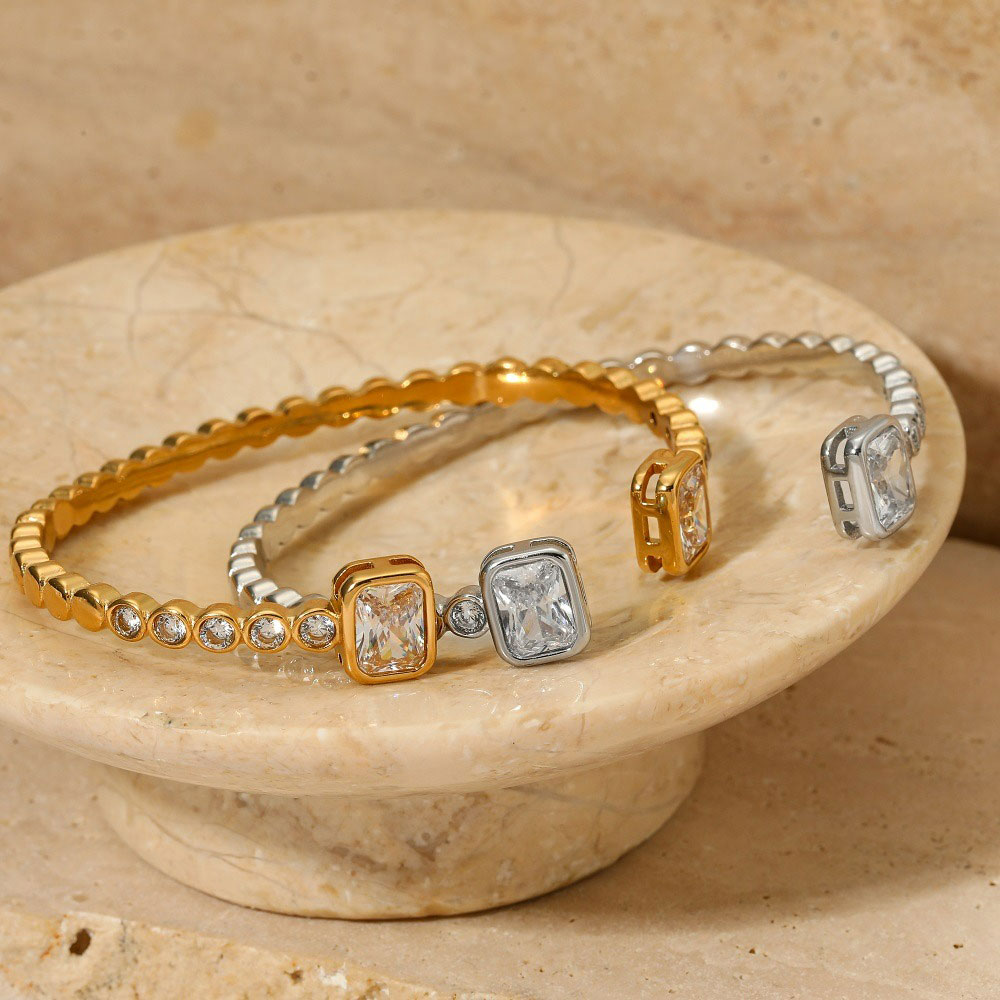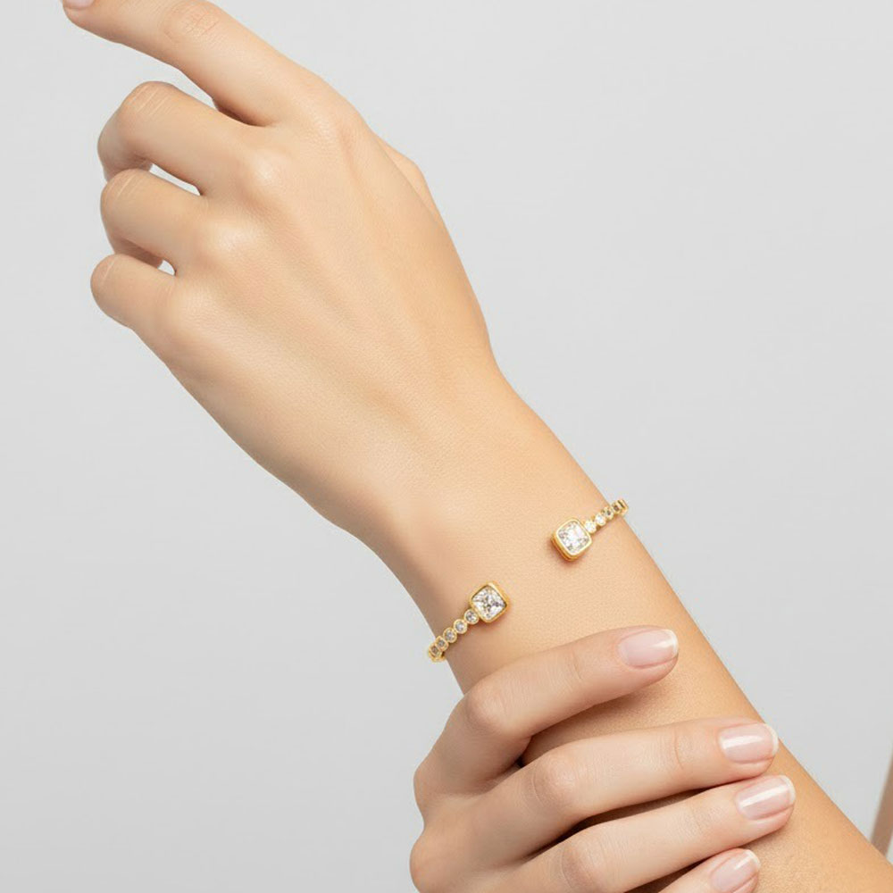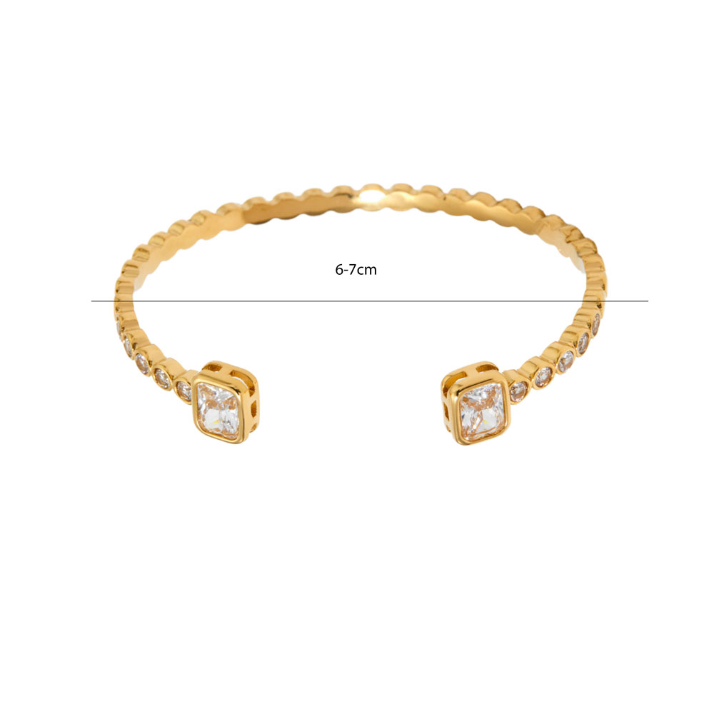 Κομψό βραχιόλι από ανοξείδωτο ατσάλι με λαμπερές τετράγωνες πέτρες στα άκρα και διακριτική διακόσμηση από μικρές πέτρες κατά μήκος. Ο ανοιχτός σχεδιασμός του προσφέρει άνετη εφαρμογή και μοντέρνα αισθητική, ενώ η χρυσή απόχρωση χαρίζει πολυτέλεια και διαχρονική κομψότητα. Ιδανικό για καθημερινή χρήση αλλά και για πιο elegant εμφανίσεις, φοριέται μόνο του ή σε συνδυασμό με άλλα βραχιόλια για ένα εντυπωσιακό layered αποτέλεσμα.