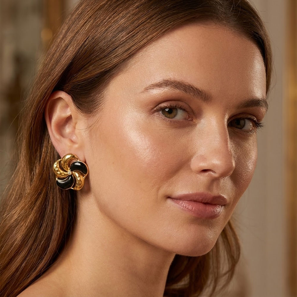 Εντυπωσιακά σκουλαρίκια με σχέδιο στρόβιλου και δίχρωμη αντίθεση, που συνδυάζουν κομψότητα και δυναμικό χαρακτήρα. Ιδανικά για elegant αλλά και statement εμφανίσεις, προσθέτουν ιδιαίτερο στιλ τόσο σε καθημερινά όσο και σε βραδινά looks. Υλικό:Ατσάλι