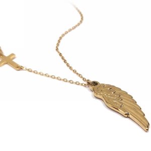 Κολιέ Ατσάλι 316L, αλυσίδα με σταυρό και φτερό σε χρώμα Χρυσαφί