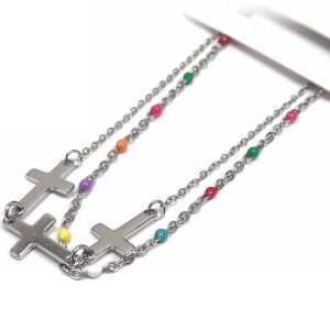 Βραχιόλι Ποδιού Ατσάλι 316L, διπλη αλυσίδα με σταυρούς και πολύχρωμες χάντρες σε χρώμα Ασημί