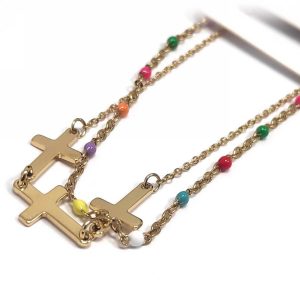 Βραχιόλι Ποδιού Ατσάλι 316L, διπλη αλυσίδα με σταυρούς και πολύχρωμες χάντρες σε χρώμα Χρυσαφί