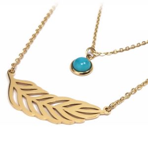 Κολιέ Πέτρα 316L, διπλή αλυσίδα με τυρκουάζ σε χρώμα Χρυσαφί, Μήκος 40cm