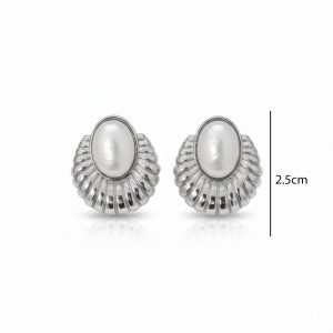 Σκουλαρίκια Ατσάλι με Οβάλ Στοιχείο & Ανάγλυφο Κέλυφος Ασημί
