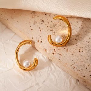 Ατσάλινα Χρυσά Σκουλαρίκια Ημικύκλιο με Πέρλα